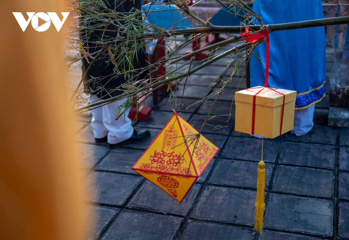Đội rước nêu khởi hành trong âm thanh của Tiểu nhạc tiến vào Hoàng cung, đến cửa chính của khu vực Thế Miếu và tiến hành nghi thức dựng nêu.