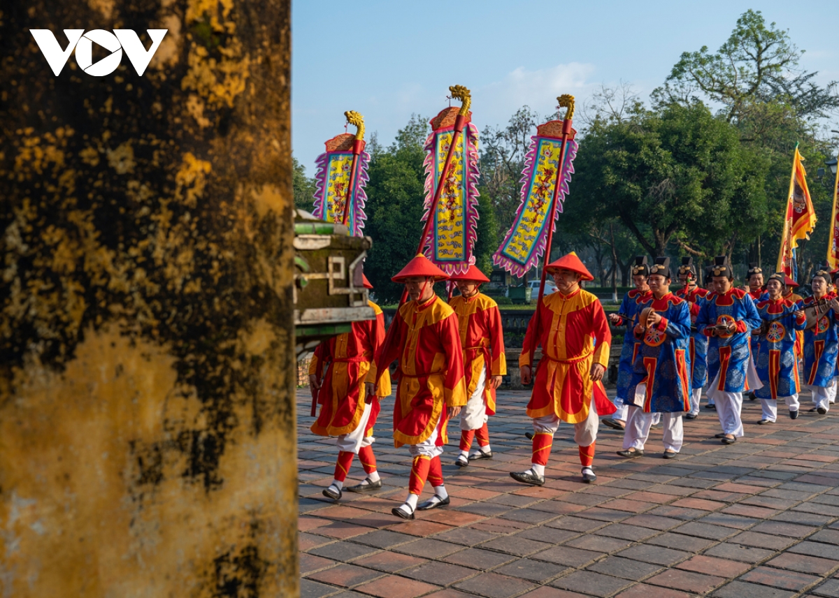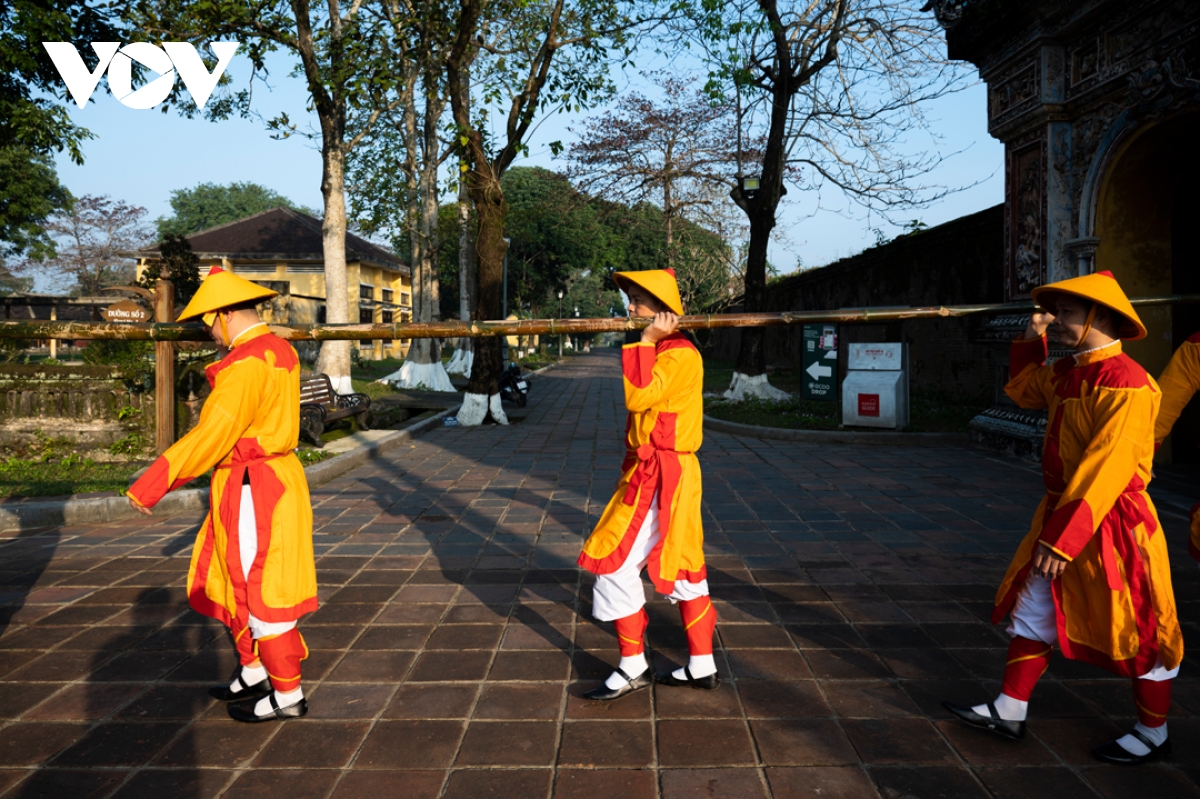Nghi thức rước nêu bắt đầu từ cửa Hiển Nhơn với 10 người lính trong trang phục chỉnh tề vác cây nêu.