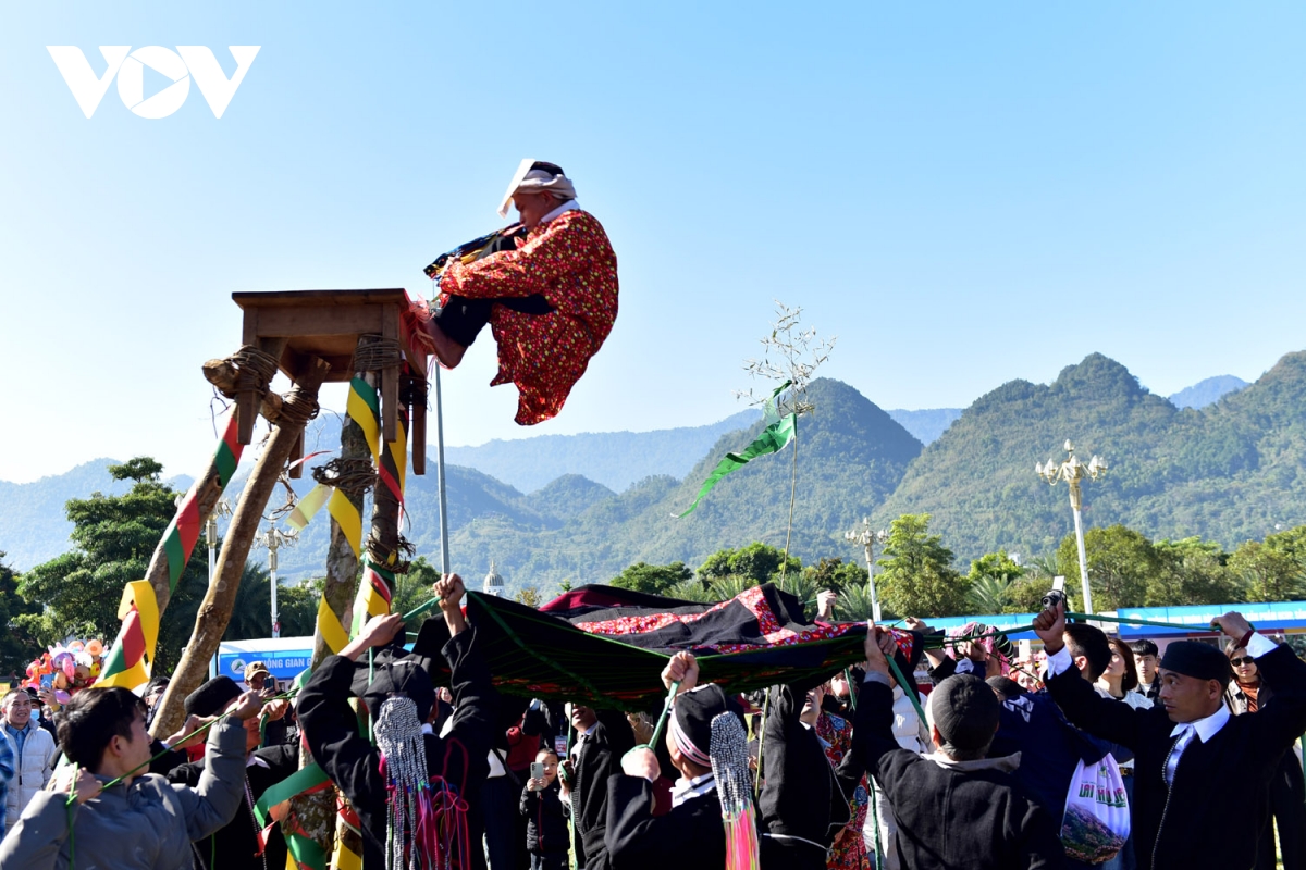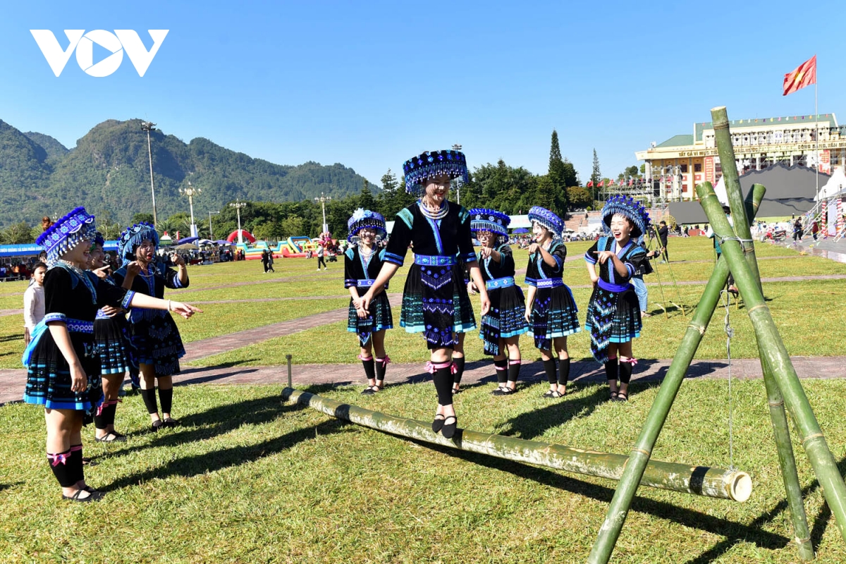 Phụ nữ Mông xanh thích thú bên trò chơi đi cầu thăng bằng.