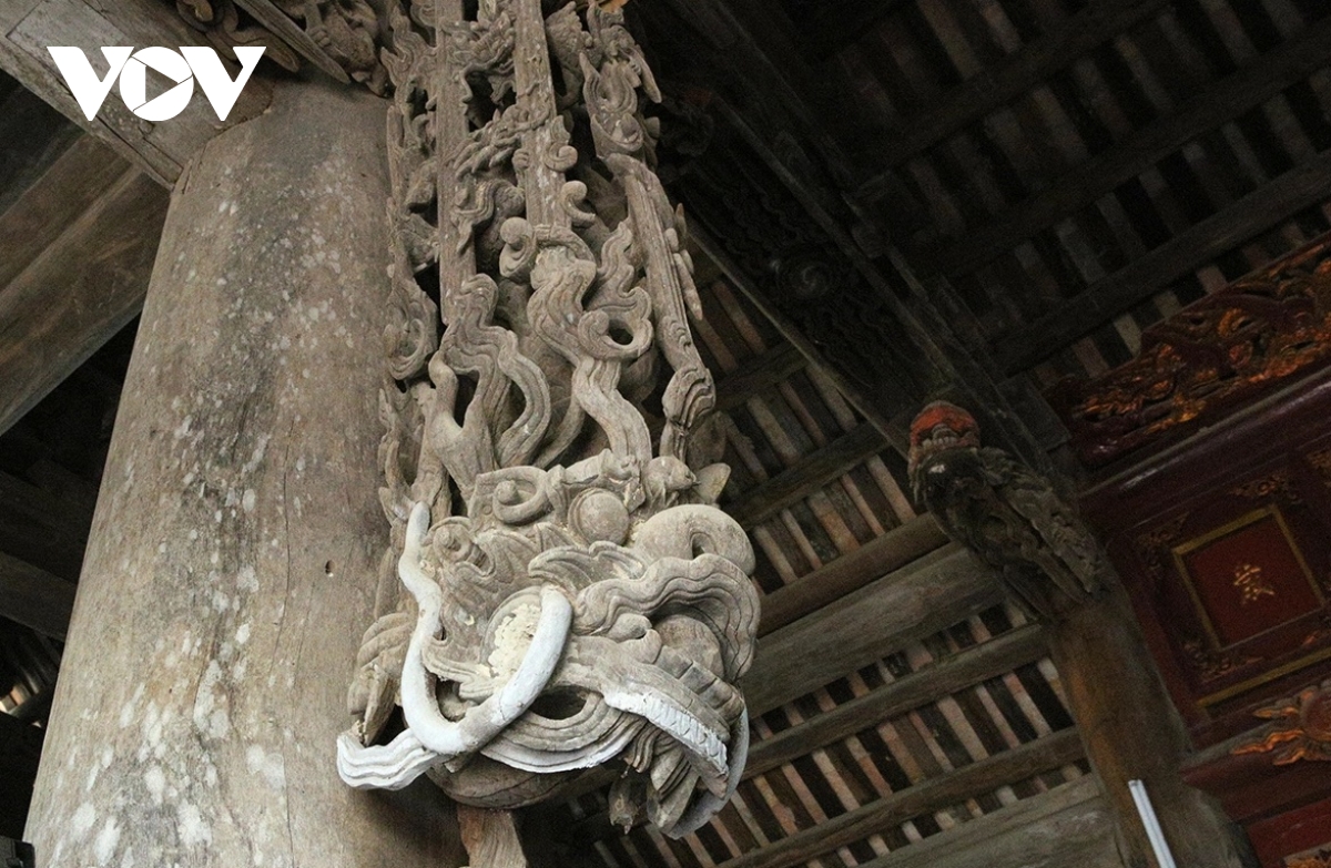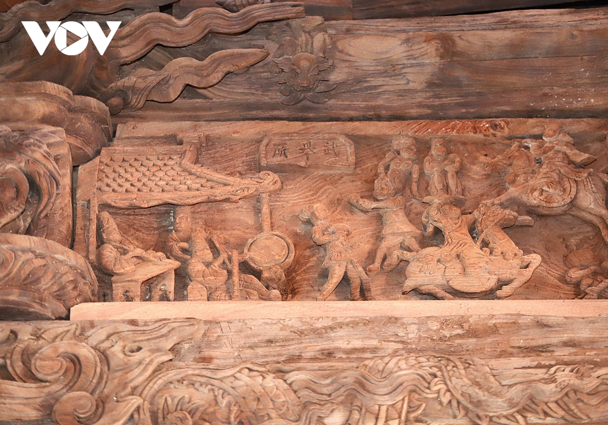 Bức chạm khắc tại đình trước thời điểm trùng tu. Hippolyte Le Breton cũng ghi lại nhiều bức ảnh về nghệ thuật chạm khắc tại đình như: Hai con rồng chầu mặt trăng, hai bên có hai con phượng; đám rước quân lễ với voi, trống đồng, quân lính cầm giáo; cuộc đua thuyền trên sông Lam; cuộc đánh cờ người, gồm 16 nam giới và 16 thiếu nữ làm quân cờ...(Ảnh: Hải Chi).