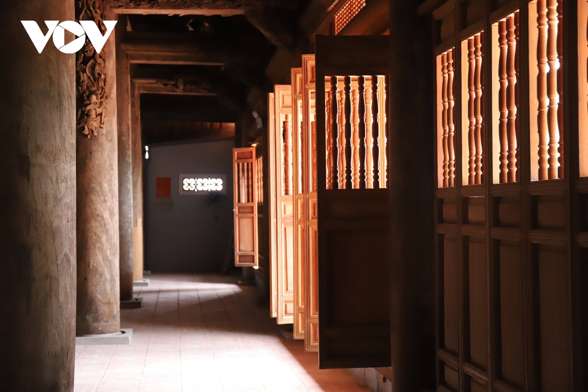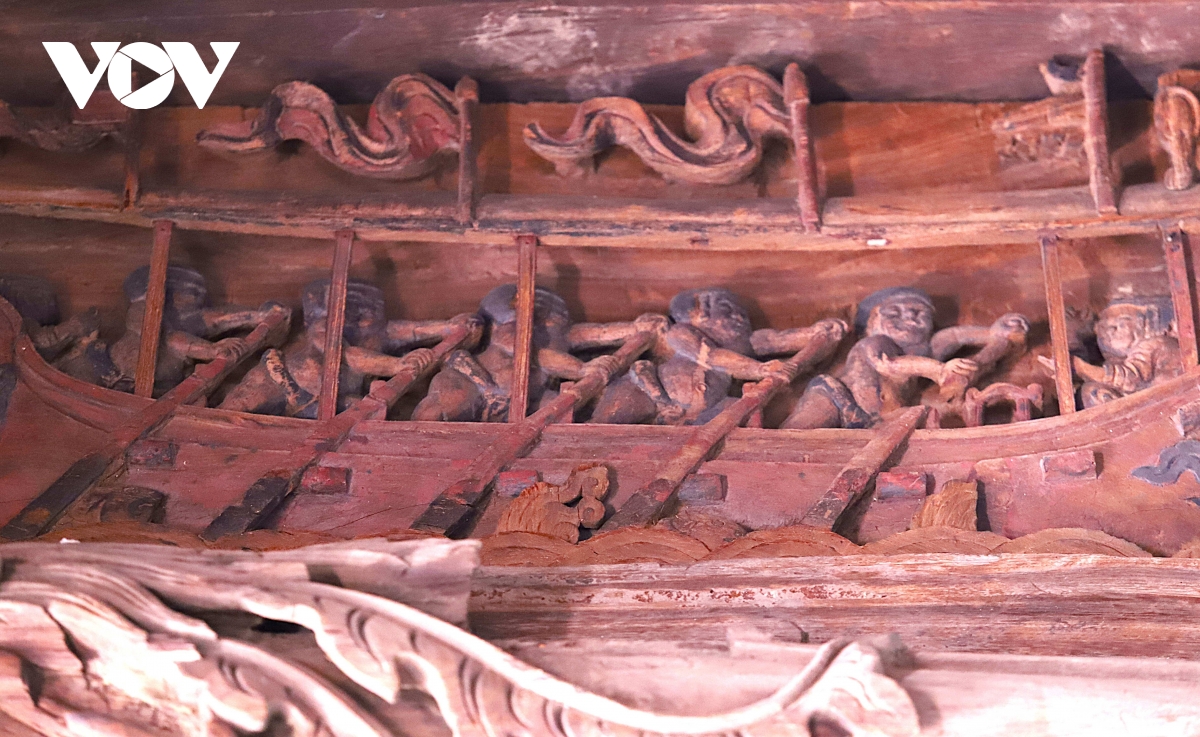 Đặc biệt, trong khi các đề tài dân dã hầu như không còn ở thế kỷ 18 thì tại đình các hình tượng đó vẫn phổ biến, như: Chèo thuyền, đi cấy, thưởng trà, câu cá... Ngoài việc chạm khắc các đề tài trên cấu kiện gỗ, ở gian giữa của đại đình, các nghệ nhân xưa còn tô điểm thêm bằng những bức y môn đẹp, đậm chất nghệ thuật cùng nhiều bức đại tự cổ bằng chữ Hán. (Ảnh: Hải Chi).