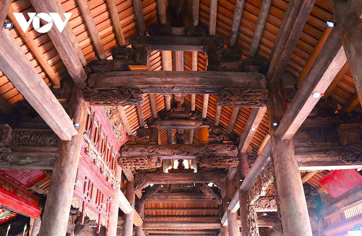 Theo tài liệu, đình rộng hơn 1.660 m2, ngoảnh hướng đông bắc, phía sau có núi, phía trước là sông Lam. Trong đó, đại đình rộng hơn 330 m2, được dựng theo lối nhà 7 gian. Đại đình được tạo bởi 6 bộ vì với 32 cột. Đây là lối kết cấu vì kèo theo kiểu "giá chiêng, chồng rường", phổ biến ở Việt Nam thế kỷ 17-18, đảm bảo sự chắc chắn, đem lại sự thoáng đãng và thuận lợi trong trang trí. (Ảnh: Hải Chi).