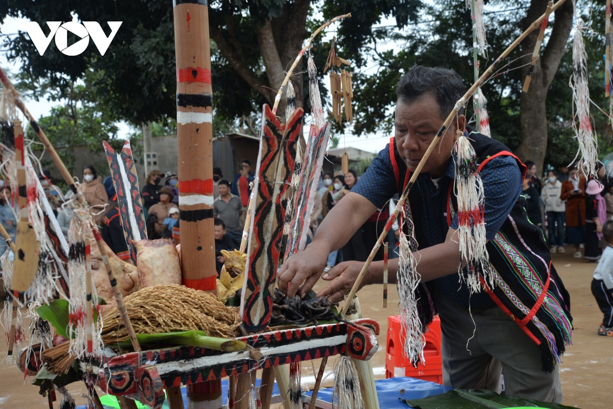 Sau khi hoàn tất công việc chuẩn bị lễ vật, lễ cúng được tổ chức trang nghiêm tại nhà cộng đồng, với sự tham gia của già làng và trưởng buôn. Những món ăn như cơm lam, thịt nướng, rượu cần… được dâng lên thần linh. Ông Vi Voan, buôn trưởng buôn Kon H'ring, cho biết: “Năm mới rất là phấn khởi, bà con rất là háo hức chào đón ngày hôm nay sau một năm lao động vất vả, hôm nay gác lại để cùng nhau về đây, ai có gì thì góp nấy trên tinh thần lễ hội là ngày của mình qua đó giữ gìn bản sắc văn hóa của người Xê Đăng từ ông cha ta để lại".