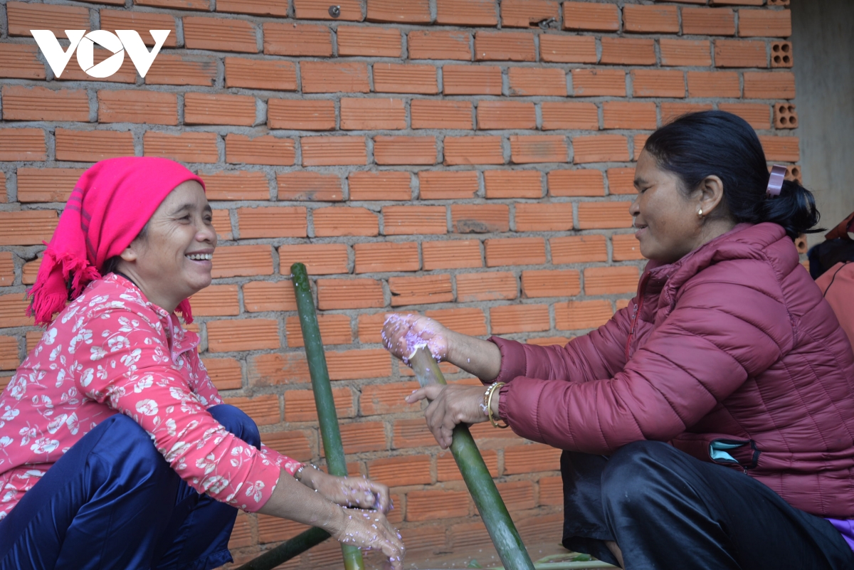 Ngay từ sáng sớm, chị Ngân đã tất bật chuẩn bị những hạt nếp rẫy thơm ngon do gia đình gieo hạt, để làm món cơm lam. Chị chia sẻ, đây là một nghi lễ quan trọng của cả buôn, nên phải chuẩn bị thật chu đáo. Gạo nếp được đãi sạch, ngâm kỹ cho đến khi hạt nếp ngậm đủ nước, rồi nhồi vào ống tre, gác lên bếp than.