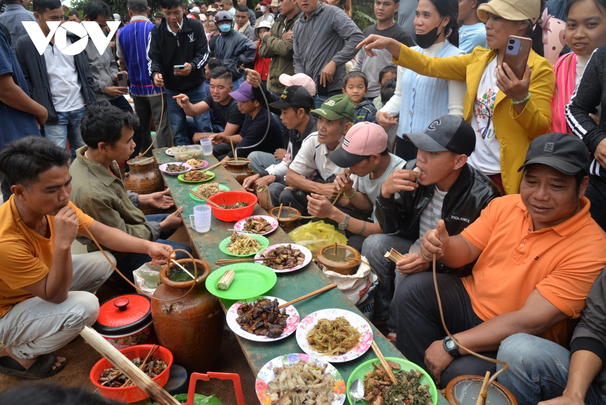 Ngay sau nghi thức cúng, cả buôn sẽ quây quần tại nhà cộng đồng, nơi mâm cơm được chia sẻ từ già làng đến trẻ em. Mâm cơm dâng thần linh giờ đây trở thành bữa ăn chung của cộng đồng, với những món ăn truyền thống: cơm lam, thịt nướng, canh rau rừng, tất cả đều được chế biến từ lúa mới và sản vật núi rừng Tây Nguyên.