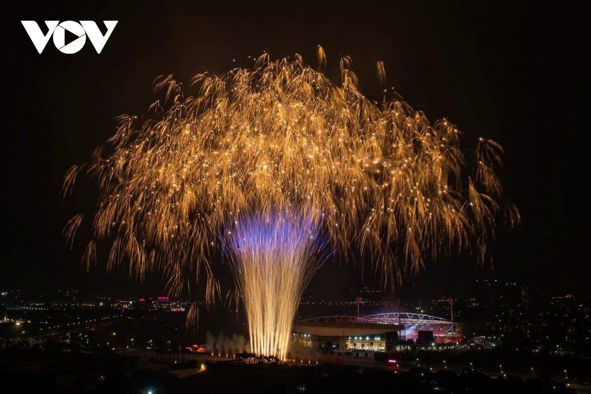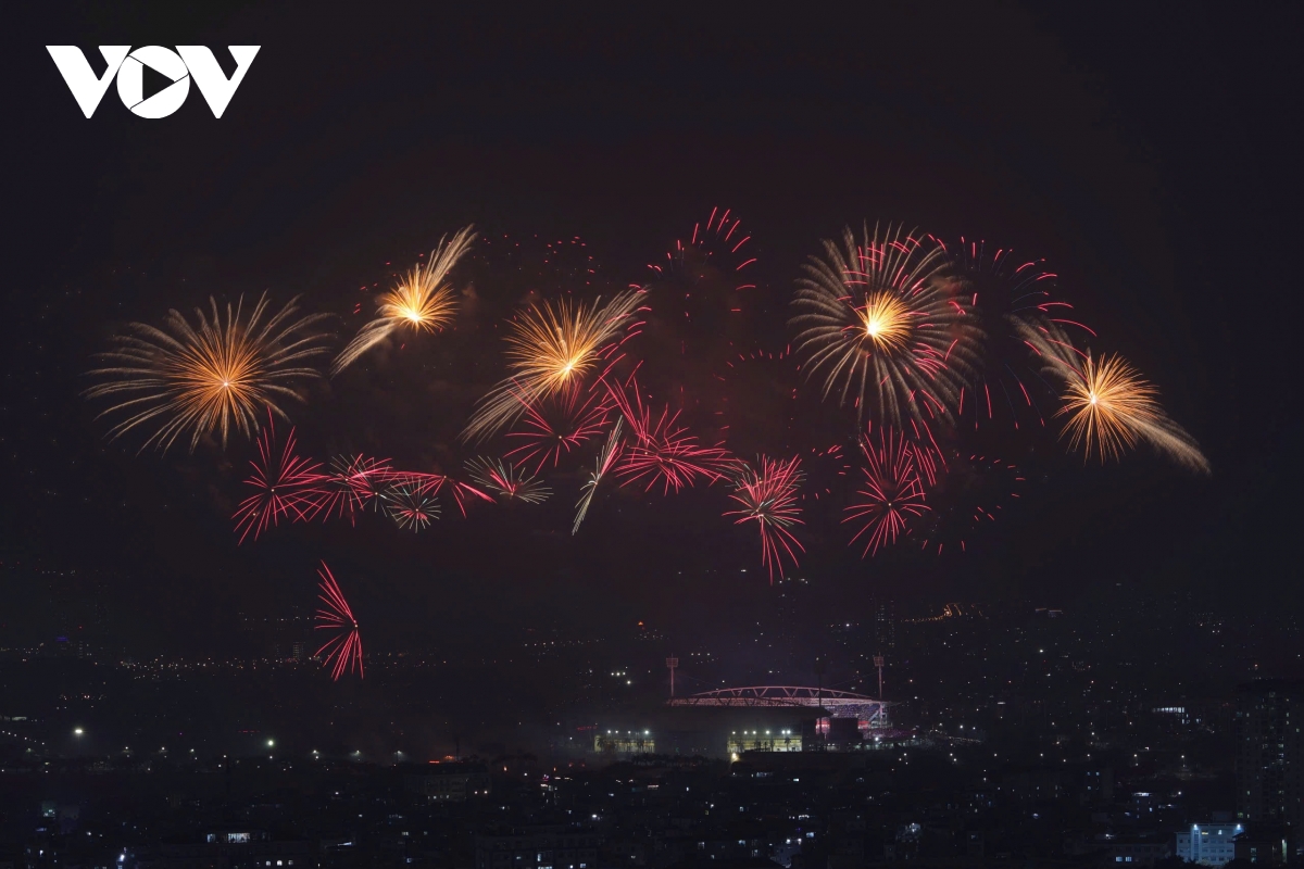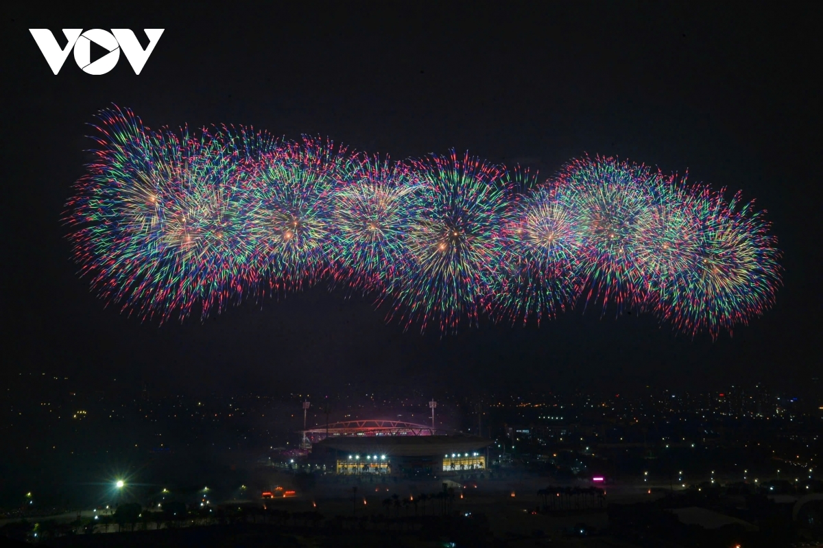 Bên ngoài sân, một trận địa pháo hoa nổ tầm cao với 4.600 quả được bố trí từ nửa đường Lê Đức Thọ qua cột đồng hồ đến bãi đất trống trước Cung thể thao dưới nước, phường Từ Liêm. Với phương án trải dài theo trục không gian này, phần pháo hoa tầm cao tạo thành các cụm nổ liên tiếp, mở rộng “mặt trận” ánh sáng ra khỏi khu vực trung tâm sân vận động, góp phần tạo nên các lớp cao trào rõ rệt theo đúng chủ đích dàn dựng.