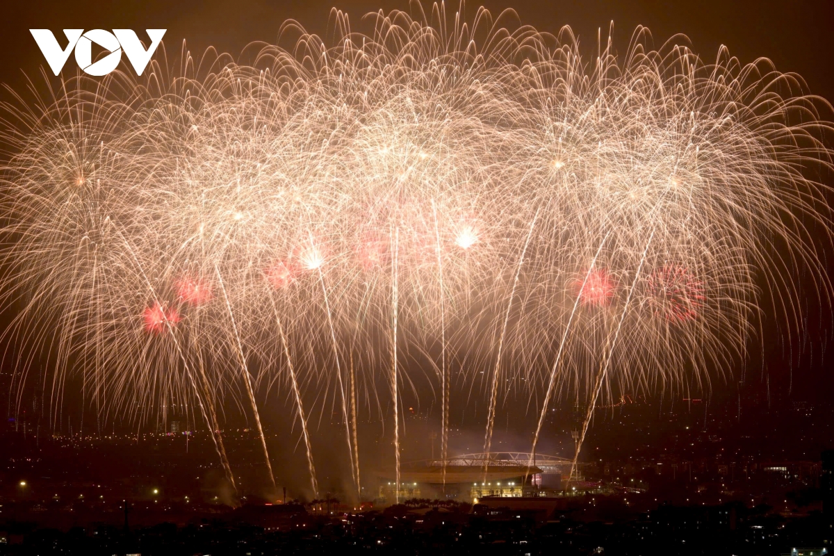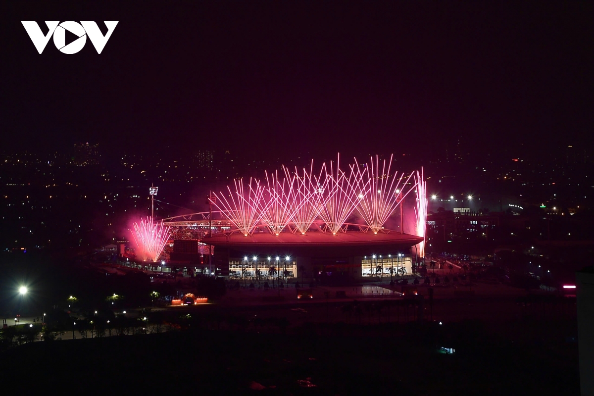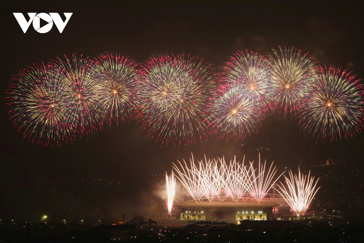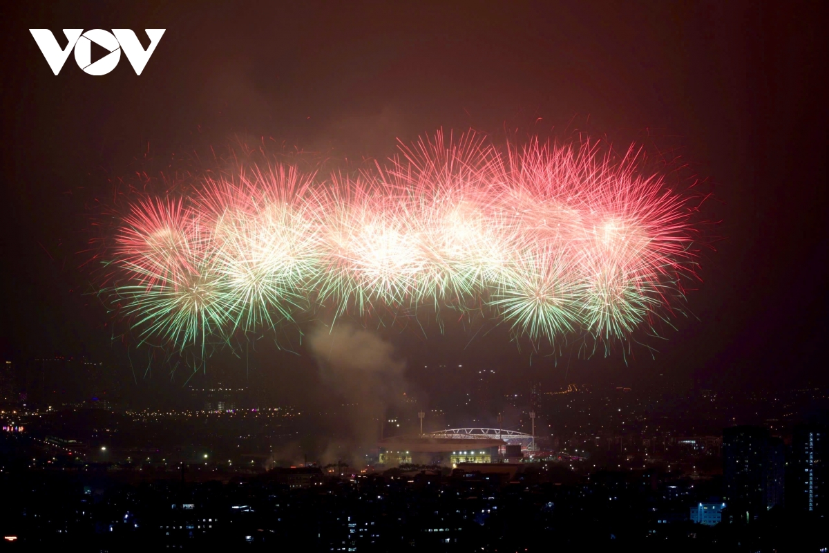 Bên ngoài sân, một trận địa pháo hoa nổ tầm cao với 4.600 quả được bố trí từ nửa đường Lê Đức Thọ qua cột đồng hồ đến bãi đất trống trước Cung thể thao dưới nước, phường Từ Liêm. Với phương án trải dài theo trục không gian này, phần pháo hoa tầm cao tạo thành các cụm nổ liên tiếp, mở rộng “mặt trận” ánh sáng ra khỏi khu vực trung tâm sân vận động, góp phần tạo nên các lớp cao trào rõ rệt theo đúng chủ đích dàn dựng.