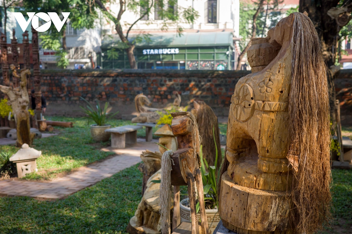 Sự kết hợp giữa ánh sáng và chất liệu giúp các tác phẩm về ngựa trở nên nổi bật, tạo chiều sâu thị giác trong không gian cổ kính của Văn Miếu.