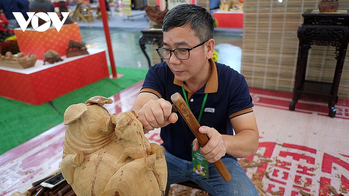 Nghệ nhân Phạm Văn Vững đến từ làng nghề chạm khắc gỗ mỹ nghệ Thiết Úng, xã Thụy Lâm, Hà Nội trình diễn nghề tại Hội chợ Mùa Xuân 2026.