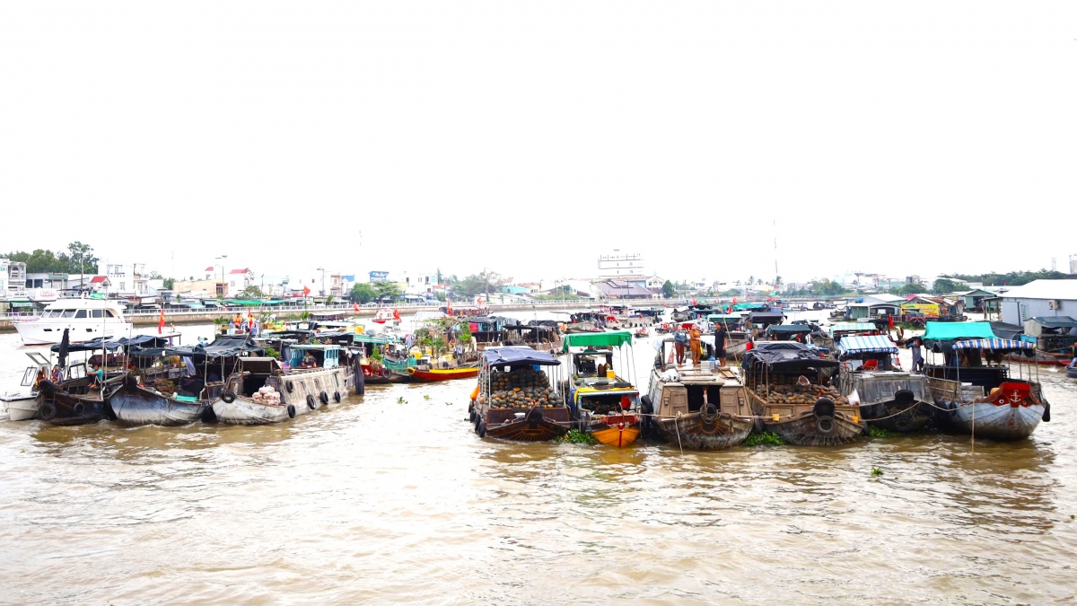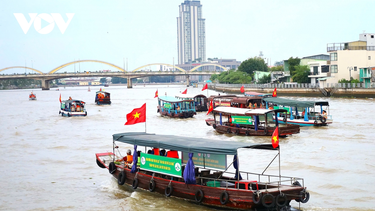 Nhiều du thuyền hạng sang cùng gần 100 tàu du lịch đã diễu hành trên sông Cần Thơ tiến về Chợ nổi Cái Răng, tạo nên nét đẹp sông nước đầy ấn tượng.