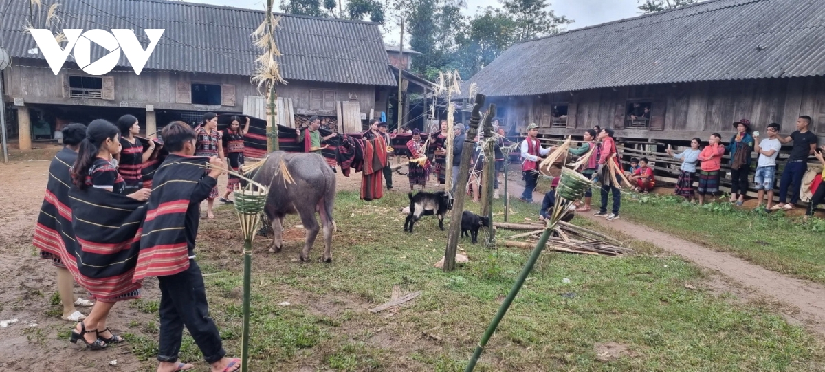 Khi các lễ vật chuẩn bị xong, 1 con dê được cột vào cây cột lễ. Già làng Hồ Xuân Văn, Trưởng dòng họ Kray, ở thôn A Liêng, xã Tà Rụt, huyện Đakrông cầm tấm nai (còn gọi là tấm Jeng - dệt thổ cẩm) đứng trước mâm lễ khấn tạ ơn thần núi, thần sông, thần mặt trời và cầu xin cho dân làng có cuộc sống yên bình, hạnh phúc, tiêu trừ bệnh tật, mạnh khỏe, ăn nên làm ra, sinh sôi nảy nở.