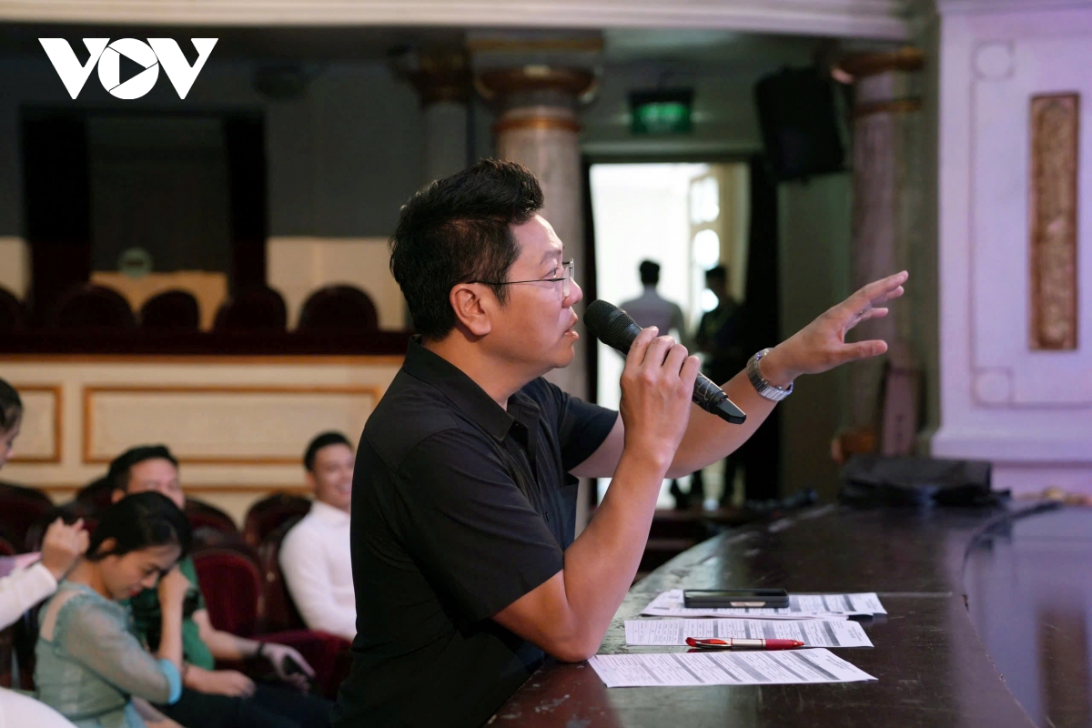 NSND Quốc Hưng, Tổng đạo diễn chương trình “Khúc ca khải hoàn" giám sát buổi tổng duyệt. Theo NSND Quốc Hưng, các tiết mục trong chương trình được đầu tư công phu cả về âm thanh, ánh sáng lẫn hình ảnh sân khấu, tạo nên một trải nghiệm nghệ thuật vừa truyền thống vừa hiện đại.