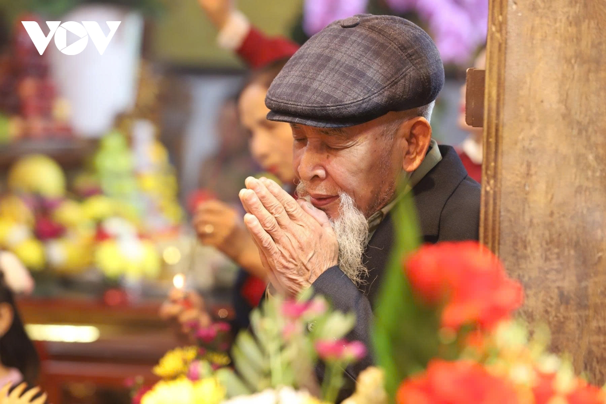 Một cụ già chắp tay khấn nguyện, hình ảnh gợi nhắc sự tiếp nối truyền thống qua nhiều thế hệ.