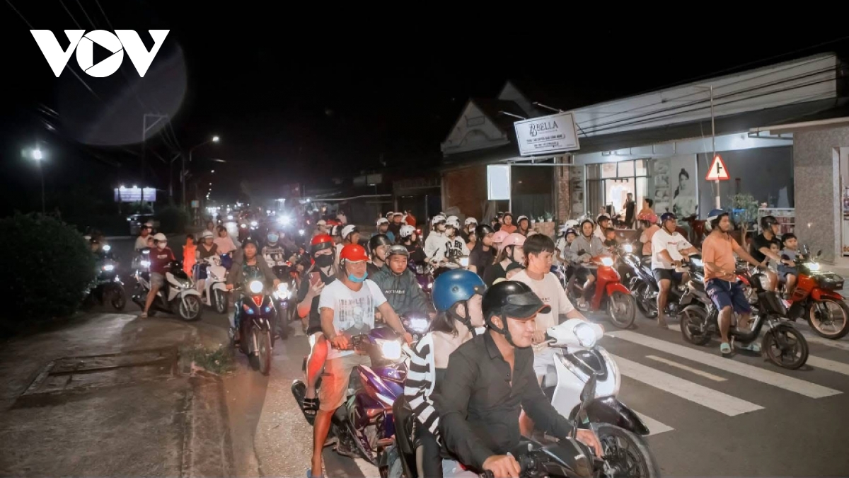 Hàng dài xe máy nối đuôi nhau theo đoàn rước đèn, tạo nên không khí lễ hội náo nhiệt khắp đường làng