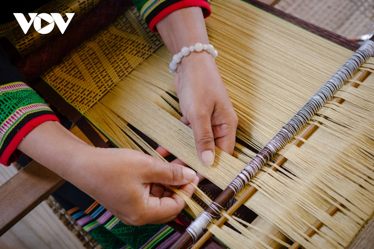 Nghệ nhân H’Sen Hmok tỉ mỉ bên khung dệt, kể câu chuyện buôn làng qua từng sợi chỉ.