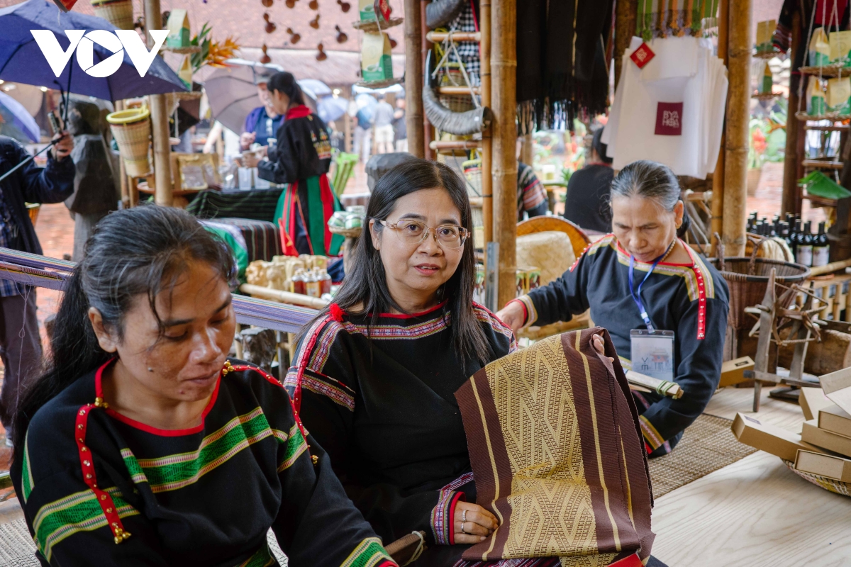 Trong gian trưng bày, nghệ nhân H’Sen Hmok (buôn Lê, xã Lắk, Đắk Lắk) kiên nhẫn bên khung dệt truyền thống. Từ sợi tơ tằm, sợi dứa đến sợi cà phê, mỗi thao tác của chị như nối dài câu chuyện của buôn làng. “Mỗi sợi chỉ là một câu chuyện. Tôi muốn giữ hồn nghề, nhưng cũng muốn nó sống được với thời đại”, chị H’Sen nói, mắt không rời những hoa văn M’Nông cổ hiện dần trên tấm vải.