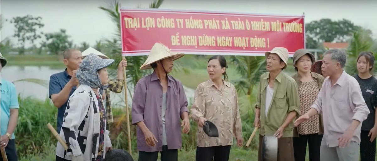 Trong "Có anh, nơi ấy bình yên" tập 22, người dân xã Tiên Phong biểu tình đòi công ty Hồng Phát ngừng hoạt động vì trại lợn xả thải gây ô nhiễm môi trường. Người dân nói muốn gặp ông chủ để đối thoại, kiểm tra trại lợn nhưng bị nhân viên đuổi về.
