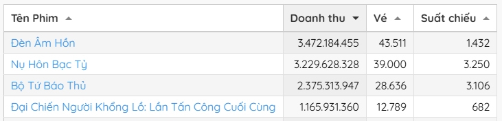 Theo thống kê của Box Office Vietnam, doanh thu trong ngày 7/2 tính đến thời điểm hiện tại của "Đèn âm hồn" là 3,4 tỷ đồng với hơn 43.000 vé bán ra. Trong khi đó, "Nụ hôn bạc tỷ" thu về 3,2 tỷ đồng. Xếp thứ 3 là "Bộ tứ báo thủ" của Trấn Thành với 2,37 tỷ đồng.