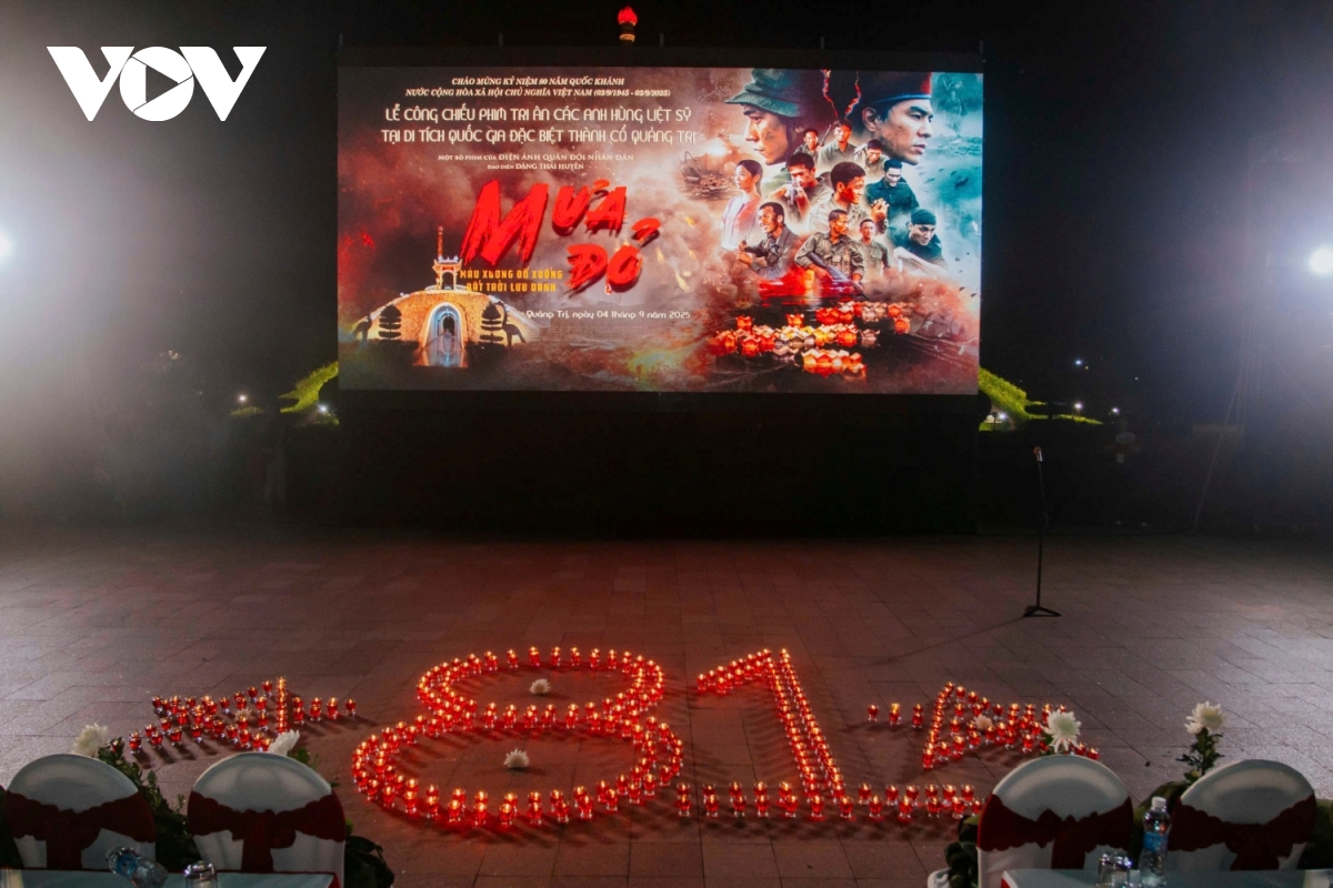 VOV.VN - Trong 3 ngày từ 4/9 đến 6/9, Điện ảnh Quân đội Nhân dân thuộc Tổng cục Chính trị, Bộ Quốc phòng phối hợp Sở Văn hóa Thể thao và Du lịch tỉnh Quảng Trị tổ chức buổi công chiếu bộ phim "Mưa đỏ", tri ân các anh hùng liệt sĩ, cựu chiến binh và cám ơn người dân tại tỉnh Quảng Trị.