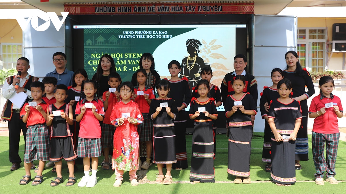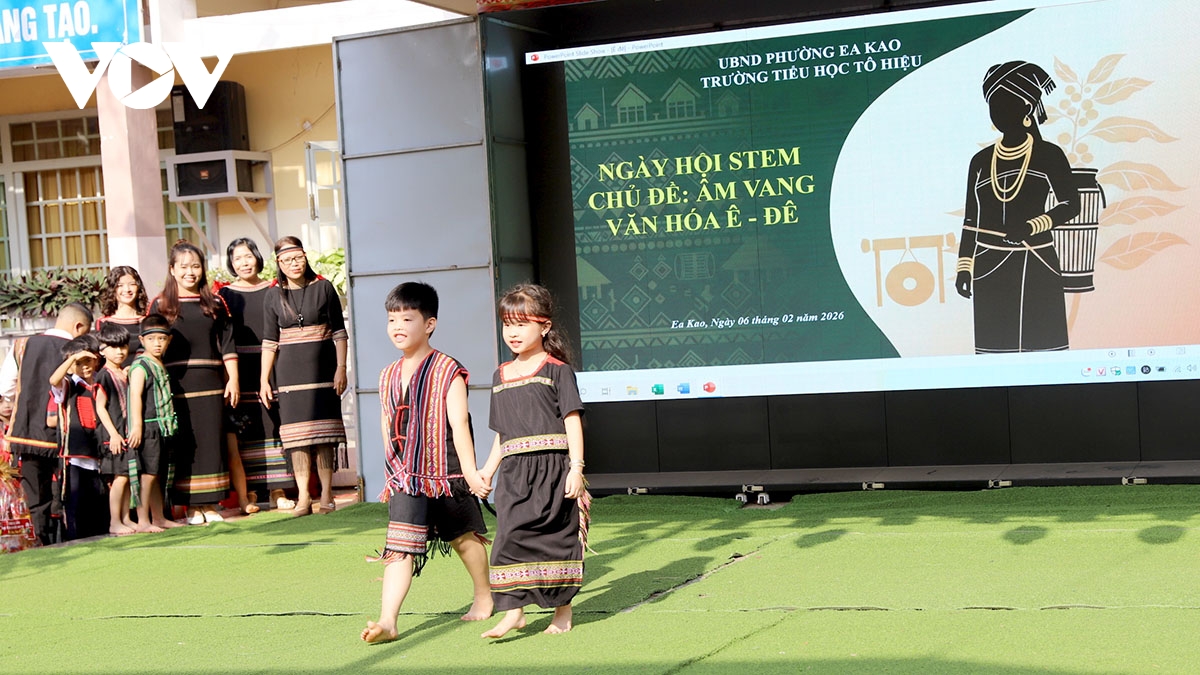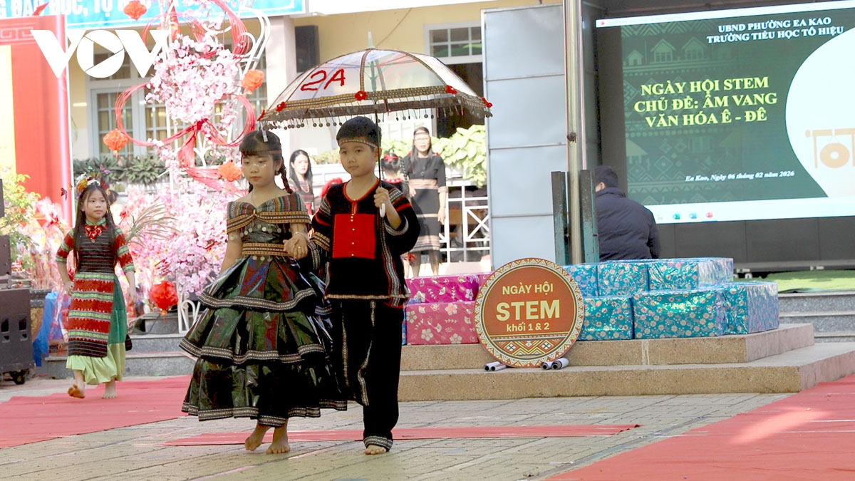 VOV.VN - Sáng 6/2, tại Trường Tiểu học Tô Hiệu, phường Ea Kao, tỉnh Đắk Lắk, diễn ra Ngày hội STEM với chủ đề “Âm vang văn hóa Ê Đê”. Đây là hoạt động ngoại khóa nhằm giúp học sinh trải nghiệm giáo dục sáng tạo, vận dụng kiến thức khoa học… để tái hiện, bảo tồn và lan tỏa những nét đẹp văn hóa truyền thống.