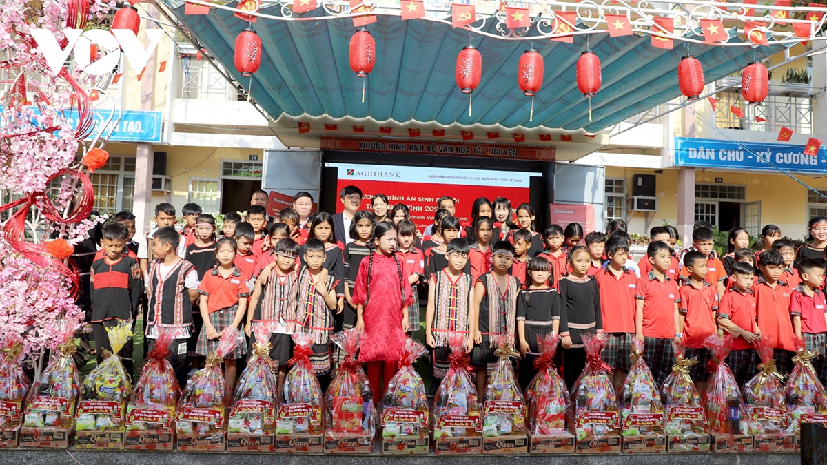 Dịp này, nhà trường còn kết nối, huy động các nguồn lực xã hội trao tặng 100 phần quà Tết và 18 thẻ bảo hiểm y tế cho học sinh có hoàn cảnh khó khăn trước thềm Tết Nguyên đán Bính Ngọ. Ảnh: Tặng quà cho các học sinh có hoàn cảnh khó khăn