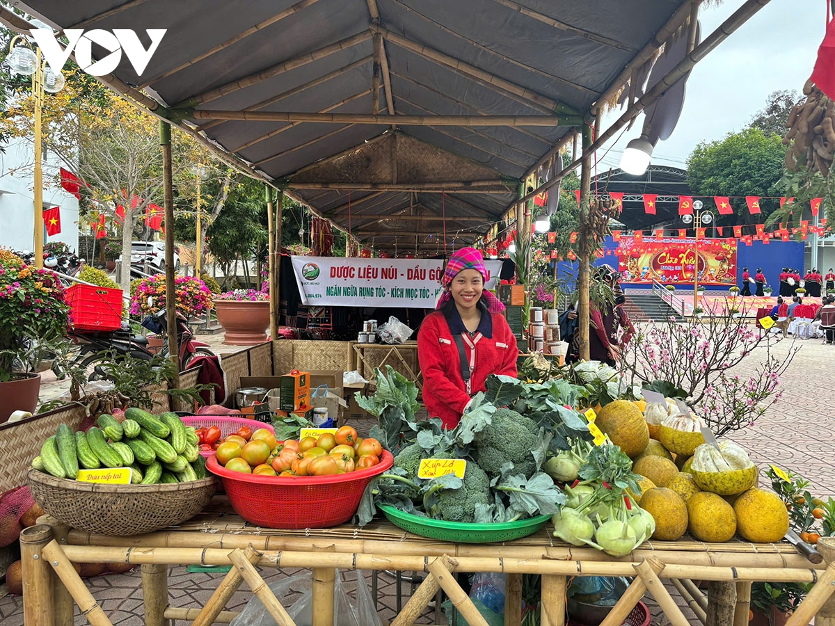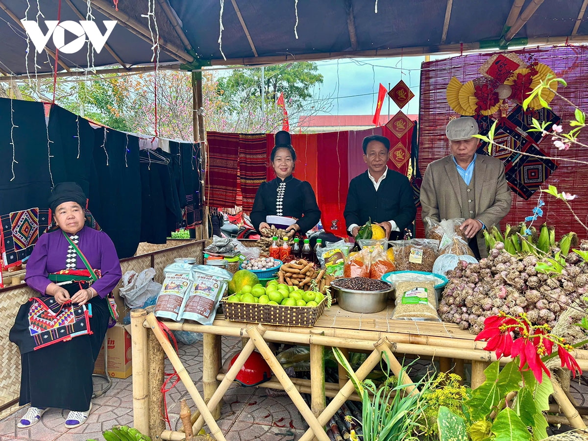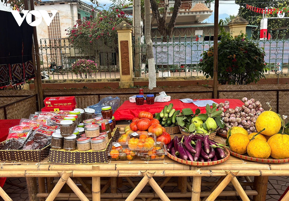 Các gian hàng chủ yếu trưng bày, giới thiệu nhiều nông sản đặc trưng của địa phương, như chẳm chéo, tỏi, chuối sấy dẻo...