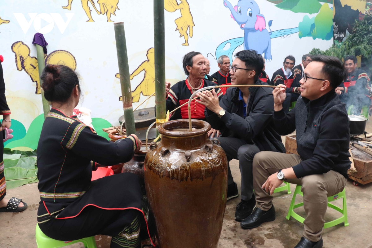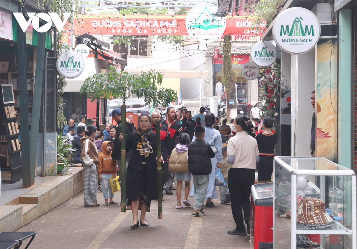 Trong không khí của ngày đầu năm mới, những người dân và du khách có mặt tại Đường sách cà phê Buôn Ma Thuột cũng hòa vào không khí lễ hội, cùng nhau thưởng thức cồng chiêng, rượu cần và ẩm thực với bà con buôn làng.