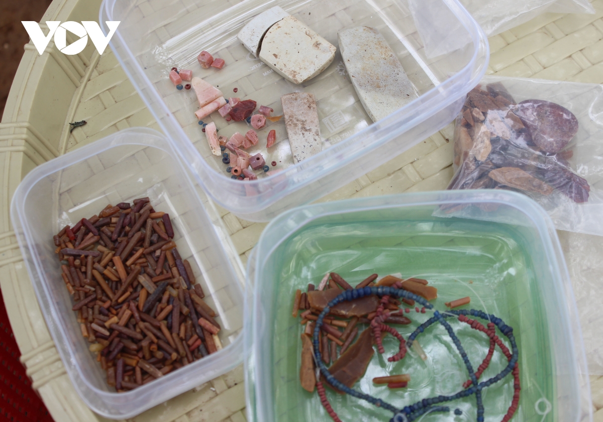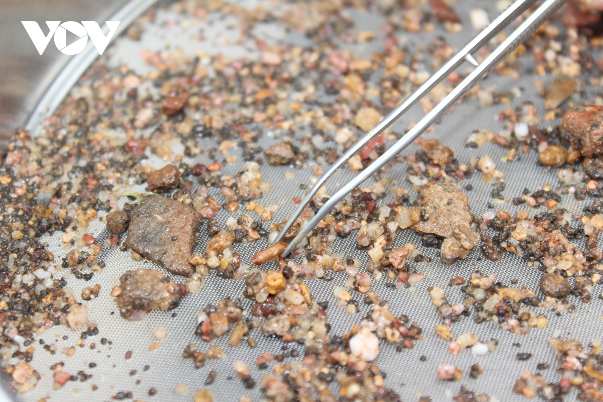 Sau khi được sàng đãi trôi sạch sẽ đất cát và các tạp vật khác, những hiện vật nhỏ dần hiện rõ.