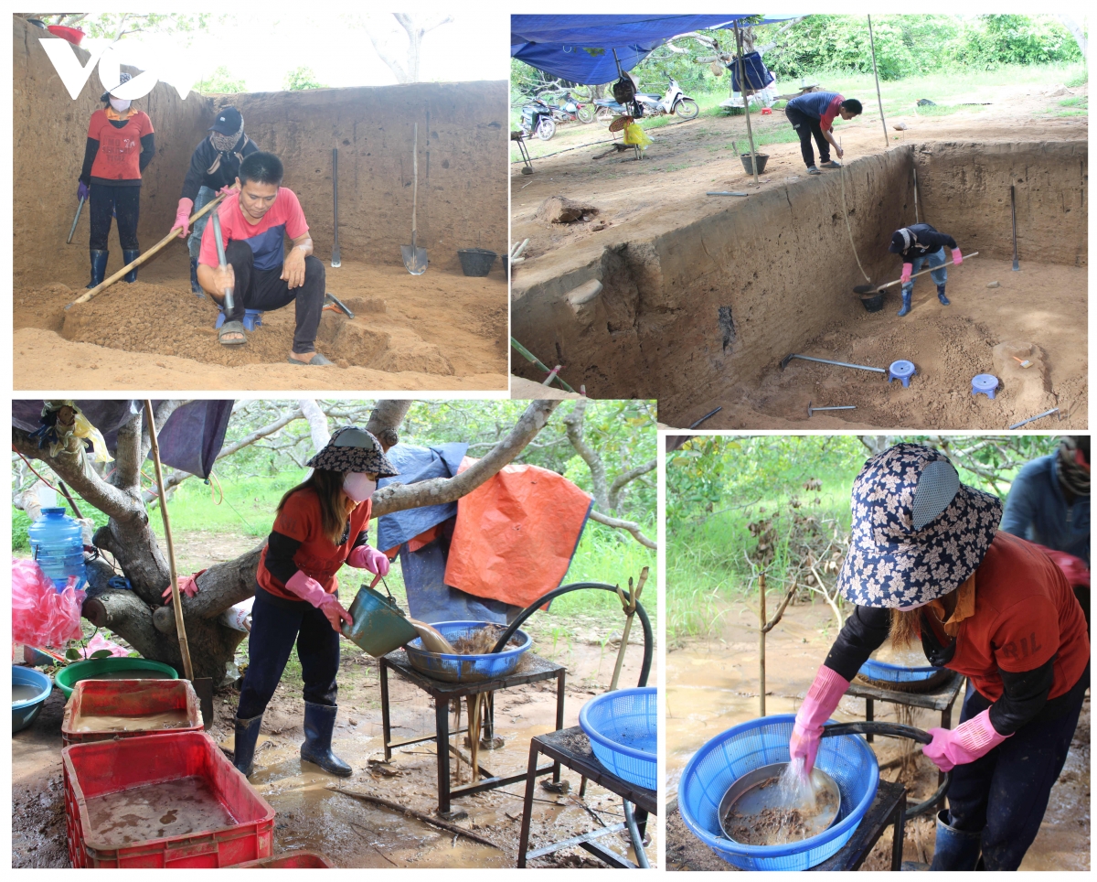 Cũng như những đợt trước, trong đợt này, đoàn khai quật chọn khu vực nhỏ để đào các hố khai quật. Trong hố rộng 20m2, họ cẩn thận đào xuống từng lớp đất từ 10-15cm, san gạt sạch sẽ, chụp hình và ghi chép đầy đủ toàn bộ dấu hiệu di tích, di vật tại mỗi lớp. Đây là cơ sở để đánh giá và xác định “Tầng văn hóa” của di chỉ.