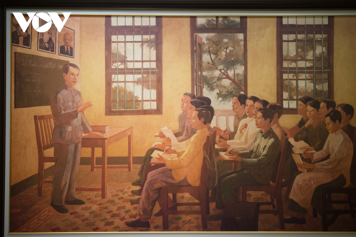 Bức vẽ Nguyễn Ái Quốc giảng bài tại lớp huấn luyện chính trị tại khu di tích.