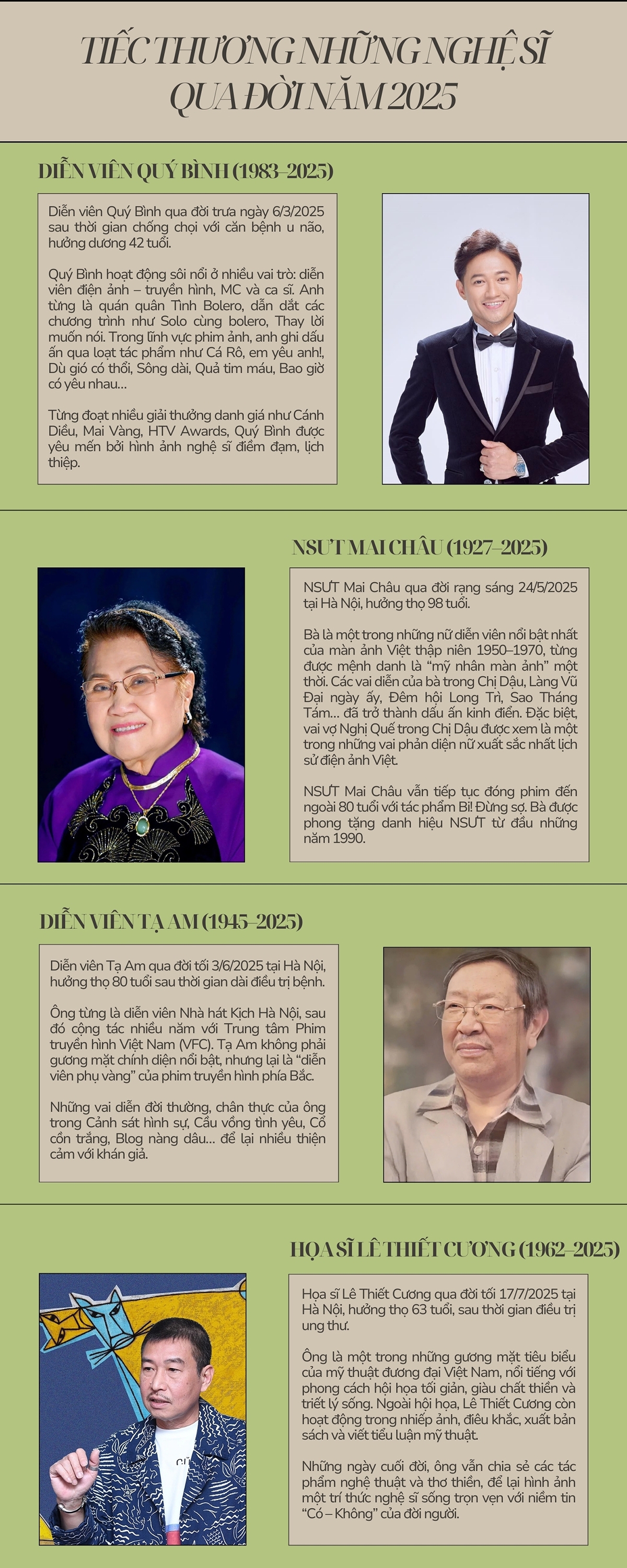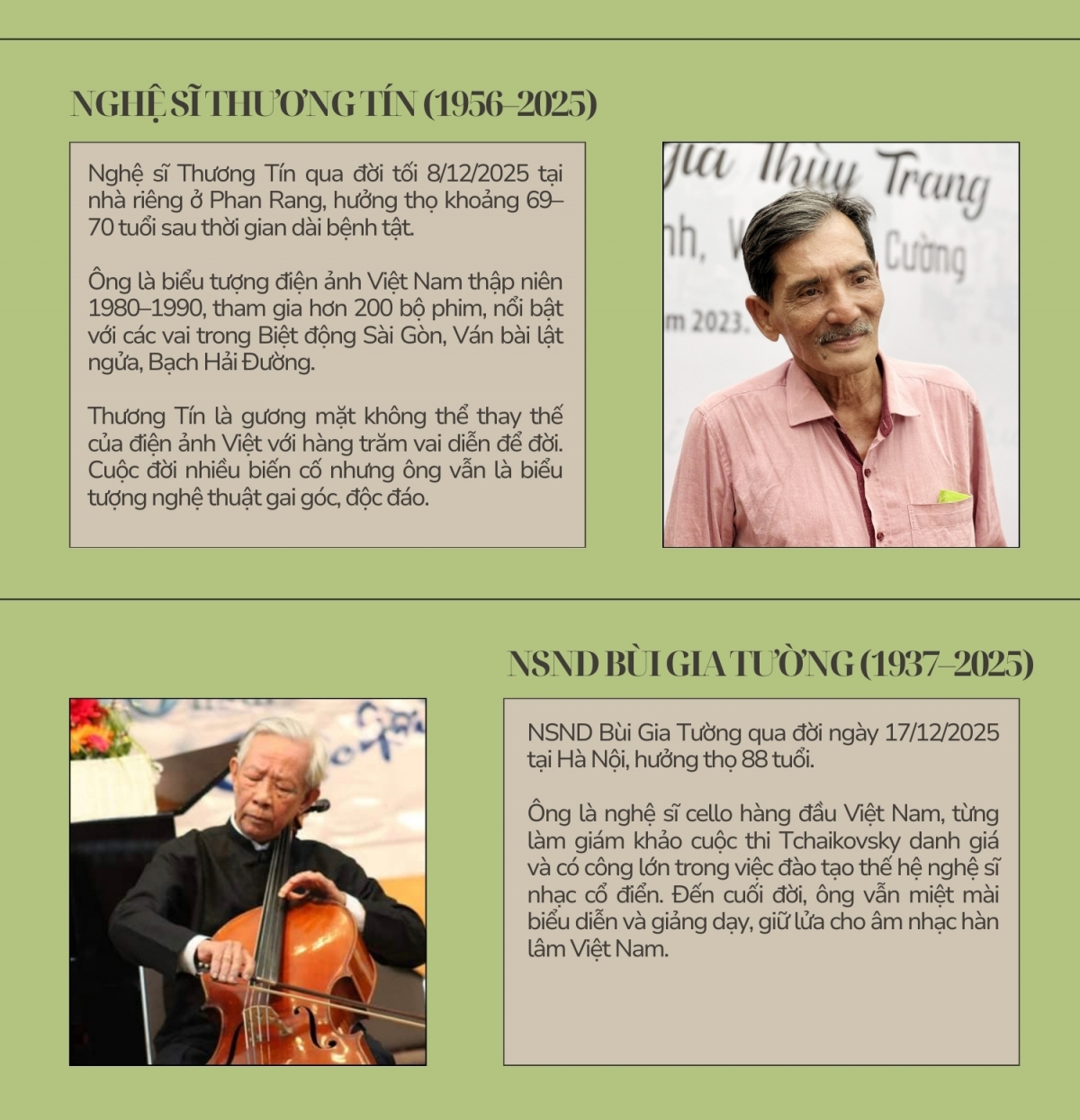 VOV.VN - Năm 2025 khép lại với nhiều mất mát lớn đối với đời sống văn hóa – nghệ thuật Việt Nam. Sự ra đi của các nghệ sĩ thuộc nhiều thế hệ, nhiều lĩnh vực khác nhau không chỉ để lại nỗi tiếc thương trong lòng công chúng mà còn khép lại những hành trình sáng tạo bền bỉ, thầm lặng và đầy cống hiến.