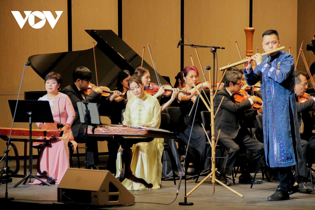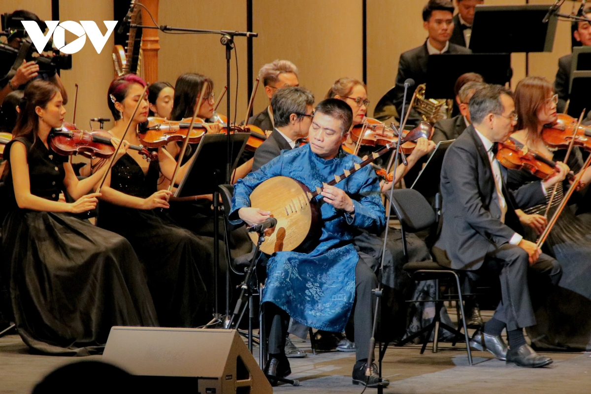 Nghệ sĩ đàn nguyệt Cồ Huy Hùng trình diễn tiết mục mang đậm âm hưởng truyền thống, tạo điểm nhấn đặc sắc khi kết hợp cùng dàn nhạc giao hưởng.