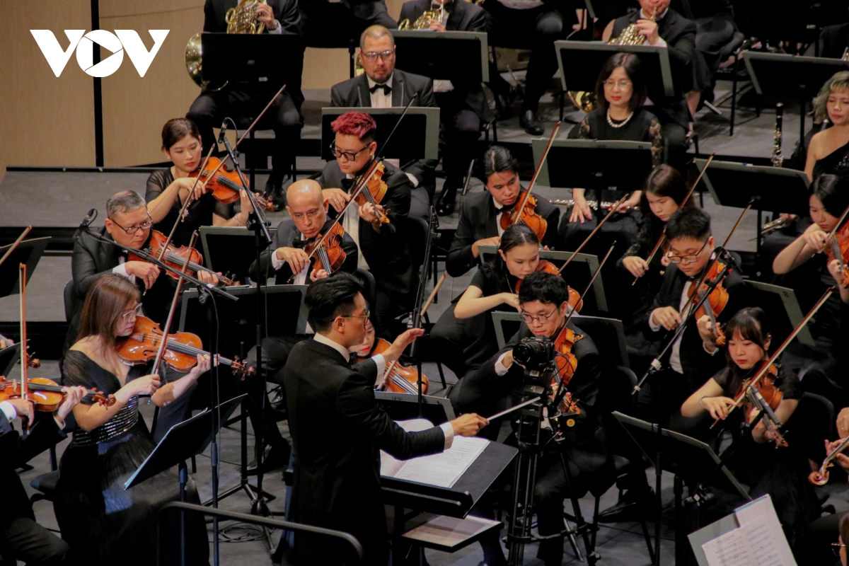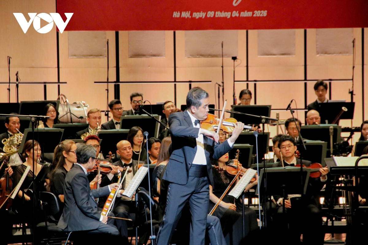 Nghệ sĩ violin Bùi Công Duy biểu diễn cùng dàn nhạc giao hưởng, mang đến những giai điệu sâu lắng, giàu cảm xúc trong chương trình.