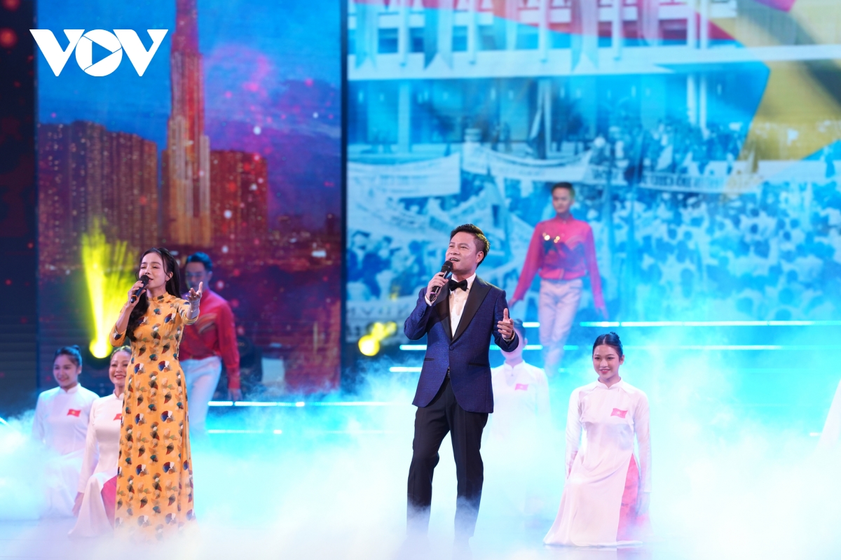 NSƯT Hoàng Tùng, NSƯT Lan Anh và Hợp xướng Học Viện Âm Nhạc Quốc Gia Việt Nam thể hiện ca khúc "Chào 50 năm thành phố rạng rỡ tên Người".
