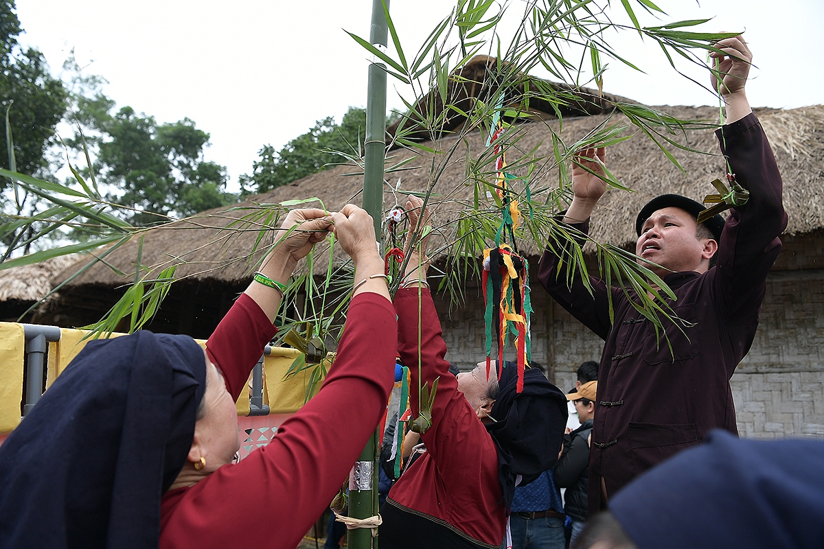 Giữa không gian nếp nhà sàn của người Cao Lan tại Làng Văn hóa, các nghi lễ của lễ hội Xuống Đồng hiện ra vừa trang nghiêm vừa gần gũi. Người dân cùng chuẩn bị bàn thờ, cây nêu trong không khí xuân rộn ràng.
