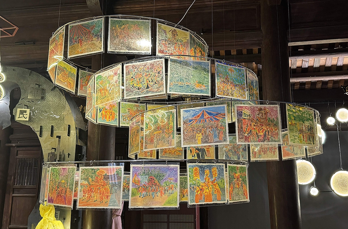 “Tác phẩm của tôi muốn gợi lại những ký ức, những hoa văn của thời Lý. Sử dụng hoa văn để nói câu chuyện của thời kỳ học hành. Người sĩ tử để học được con chữ, để tìm được cái đạo thì rất vất vả gian nan, tranh của tôi là tranh tròn và hai mặt, bên trong có đèn. Hình thức như vậy thì khi mình treo lên, hai bên đều có thể nhìn thấy được, thứ hai, những câu chuyện học hành như vậy sẽ trở nên mềm mại hơn và có sự kết hợp của hoa văn thời Lý thì nó giống như những áng mây bay”, hoạ sỹ Vũ Xuân Đông chia sẻ.