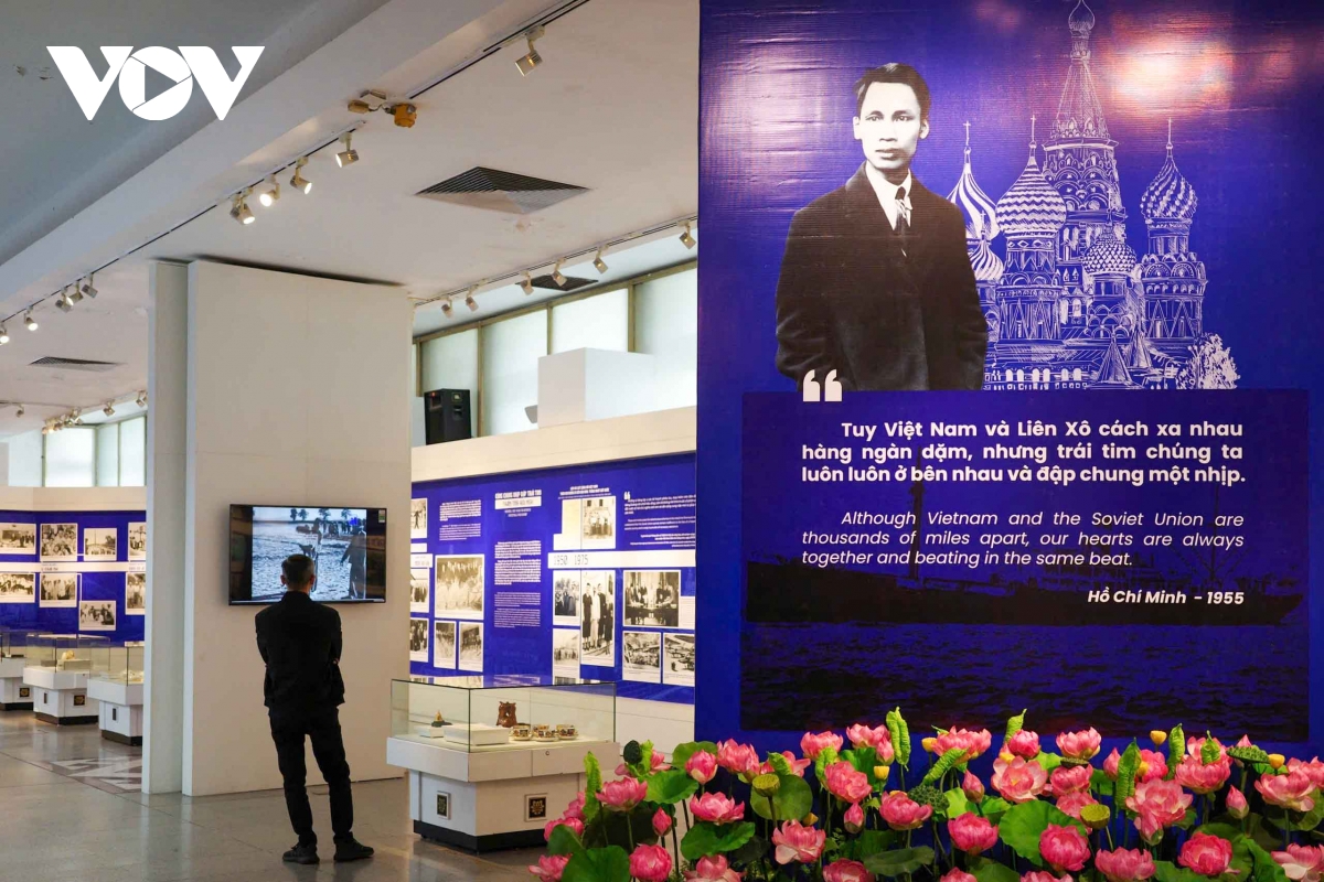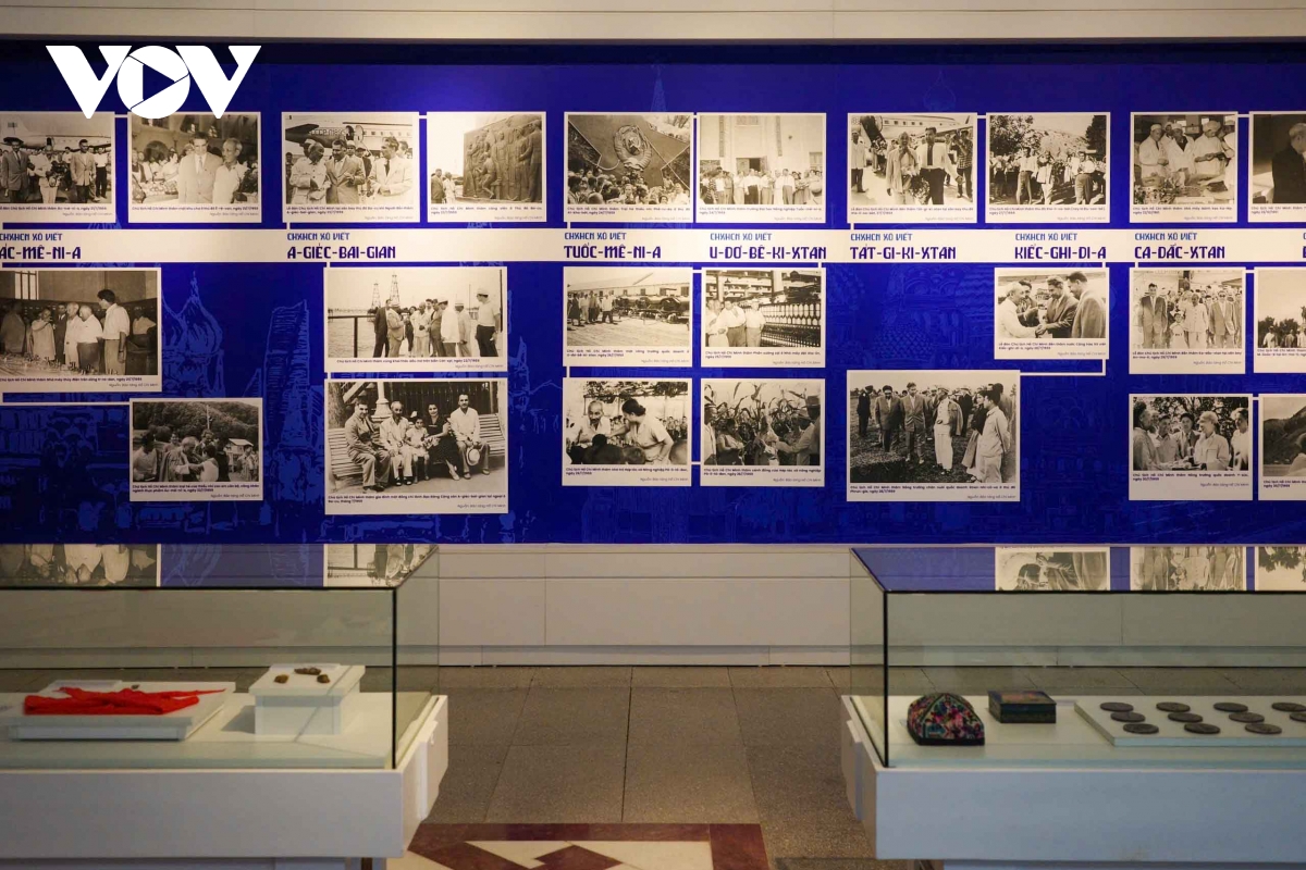 Tư liệu trưng bày về quan hệ Việt Nam-Liên Xô, giới thiệu các chuyến thăm, hội đàm và gặp gỡ nhân dân nước bạn.