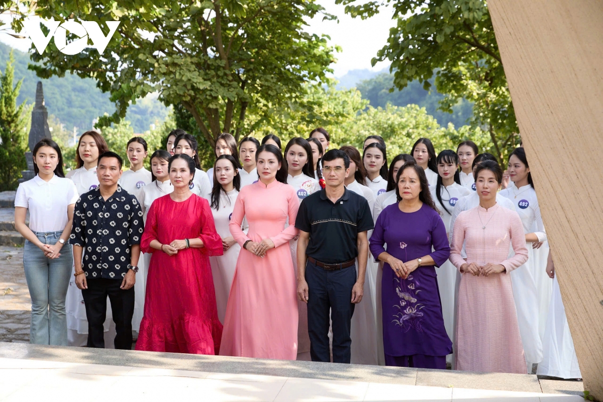 Ông Trần Xuân Việt (hàng đầu, thứ 3 từ phải qua) và đại diện BTC chụp ảnh cùng các thí sinh Cuộc thi Hoa hậu Du lịch dân tộc Việt Nam 2025 tại Mộc Châu