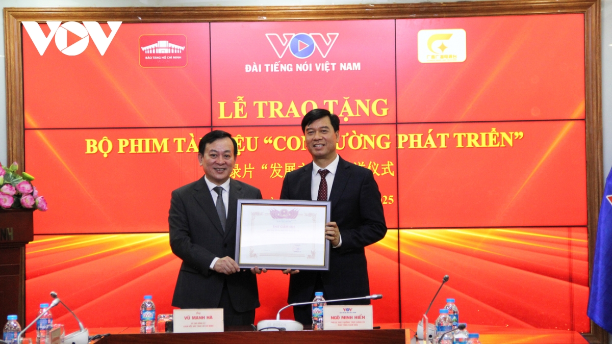 Phát biểu tại lễ trao tặng, ông Ngô Minh Hiển, Phó Tổng Giám đốc VOV cho biết, bộ phim "Con đường phát triển" được sóng trên Đài Truyền hình Việt Nam và một số đài phát thanh, truyền hình của Việt Nam trước chuyến thăm của Chủ tịch Trung Quốc Tập Cận Bình tới Việt Nam. "Chúng tôi nhận thấy đây là một bộ phim rất ý nghĩa, tổng kết lại mối quan hệ hợp tác nhiều mặt giữa Việt Nam và Trung Quốc trong nhiều thập kỷ qua. Chúng tôi thấy sẽ có ý nghĩa hơn và được lan tỏa tốt hơn nếu Đài Tiếng nói Việt Nam có thể trao tặng bộ phim này cho Bảo tàng Hồ Chí Minh".
