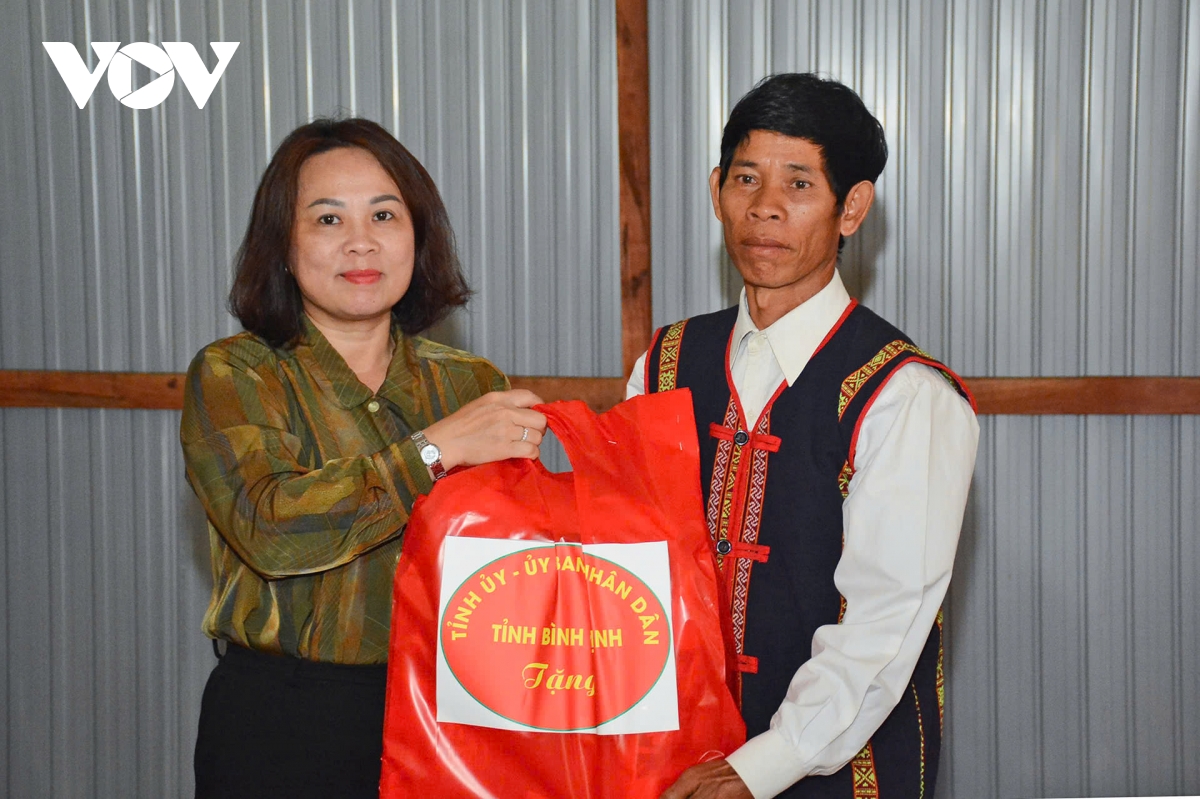 Bà Nguyễn Thị Thu Thủy, Bí thư Huyện ủy Vân Canh, tỉnh Bình Định tặng quà cho người dân làng Kà Nâu vừa xây dựng nhà kiên cố.