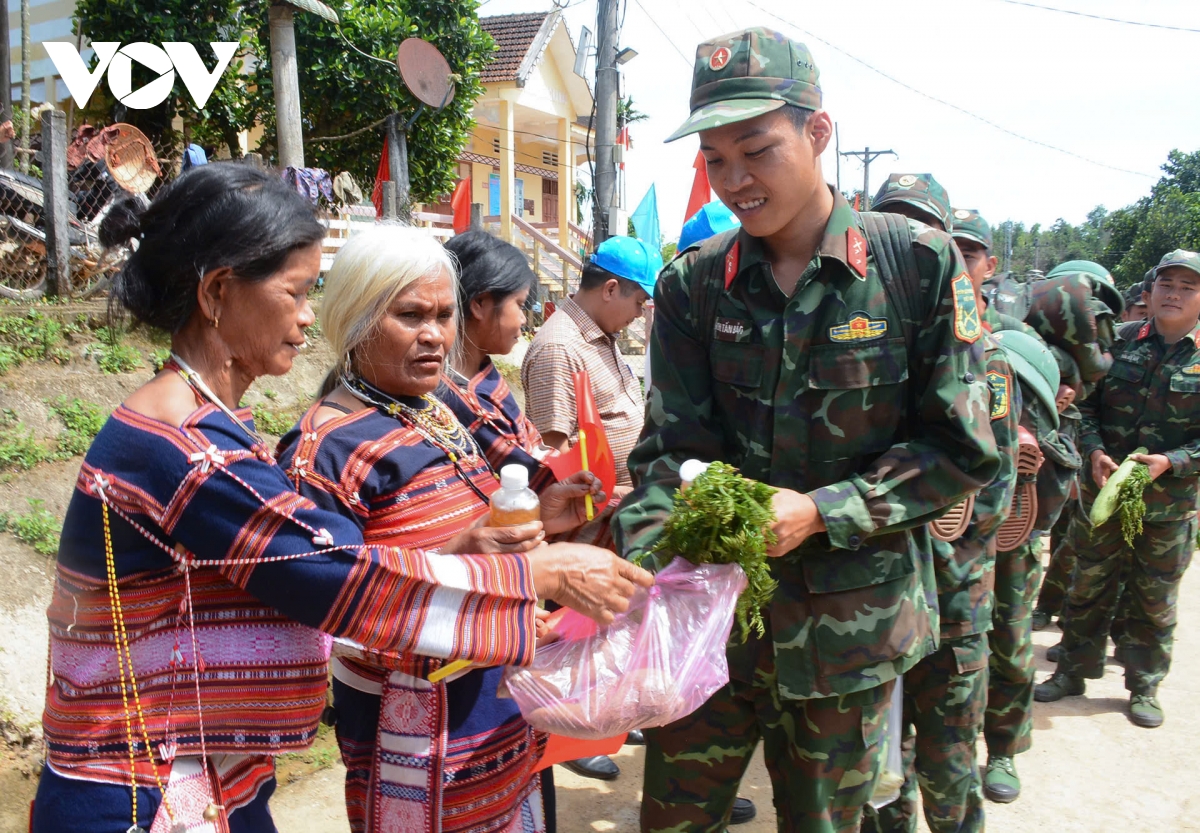 Cán bộ chiến sĩ thuộc Bộ Chỉ huy Quân sự tỉnh Bình Định chia tay bà con làng Kà Nâu, xã Canh Liên, huyện Vân Canh kết thúc hành trình hơn 60 ngày hỗ trợ người dân xóa nhà tạm.