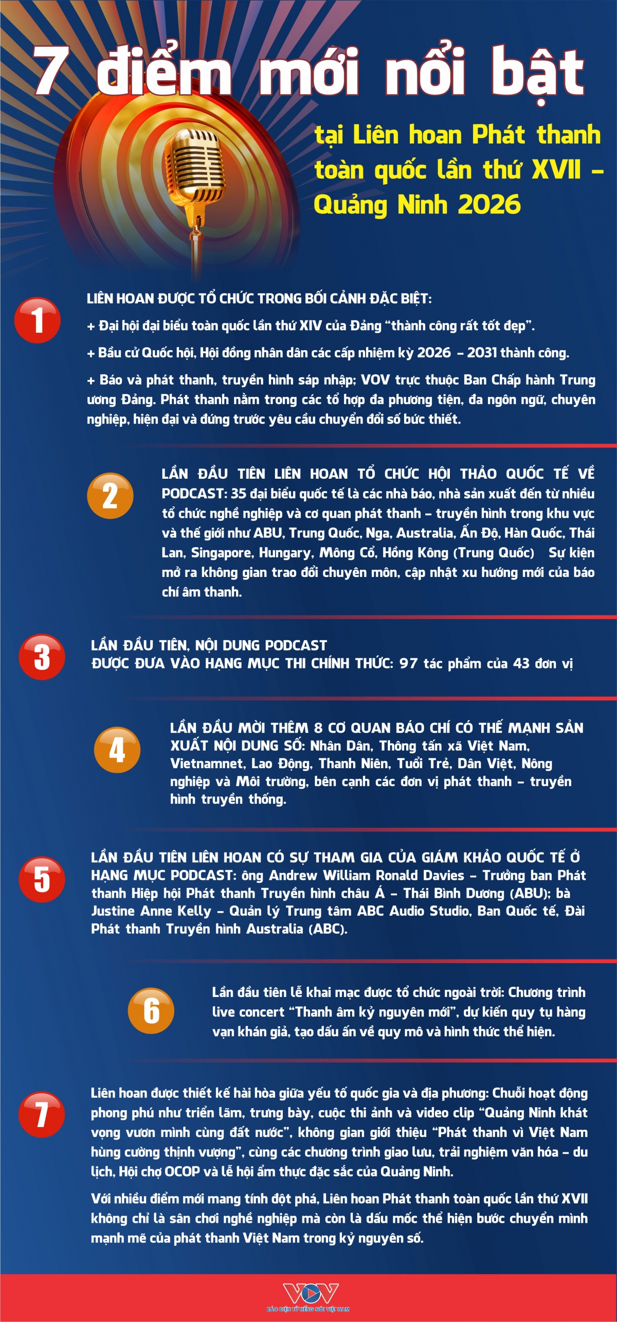 VOV.VN - Liên hoan Phát thanh toàn quốc lần thứ XVII - Quảng Ninh 2026 ghi dấu với 7 điểm mới nổi bật, hứa hẹn mang đến diện mạo tươi mới, hiện đại cho hoạt động phát thanh trong kỷ nguyên số.