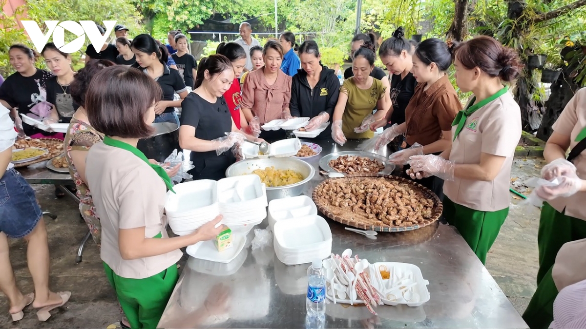 Các chị đã cùng nhau phối hợp nhịp nhàng, chế biến nhanh những suất cơm đầy đủ dinh dưỡng, kịp thời động viên các hộ bị ảnh hưởng thiên tai trên địa bàn.