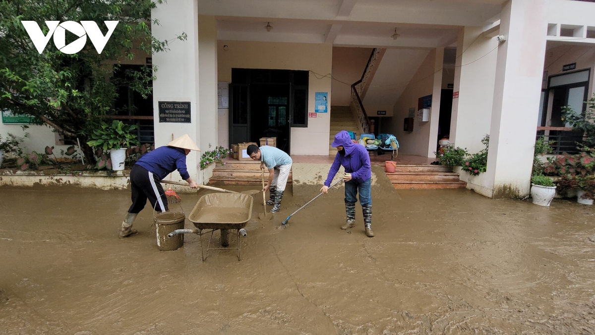 Không chỉ người dân, nhiều thầy cô giáo, cán bộ y tế từ các trạm y tế xã lân cận cũng đã đến hỗ trợ đồng nghiệp, cùng chung tay giúp sức dọn dẹp bùn đất, thu gom tài sản bị cuốn trôi.