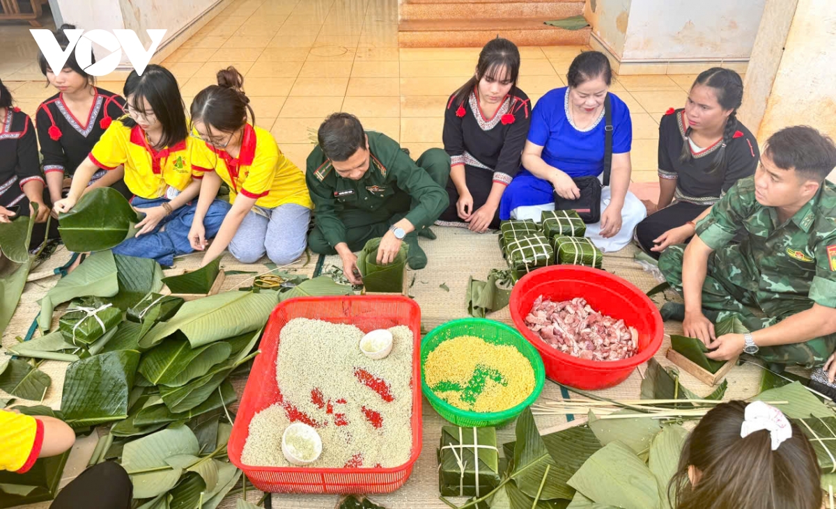 Bộ đội cùng người dân tổ chức gói bánh chưng tặng những hộ gia đình khó khăn