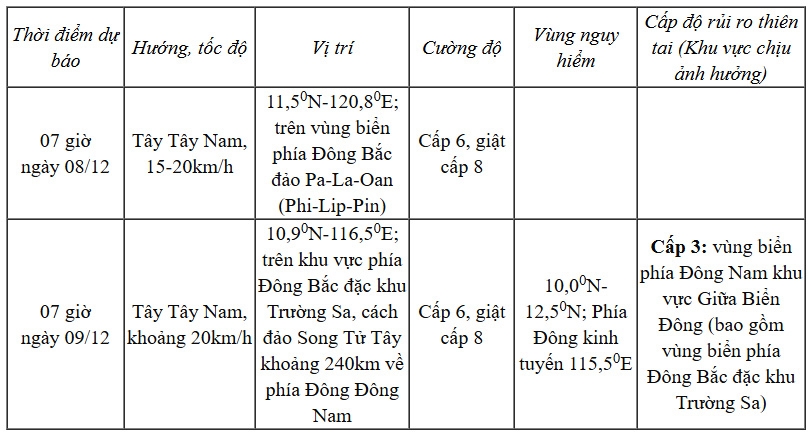 Dự báo tác động trên biển: Từ sáng 8/12, vùng biển phía Đông Nam giữa Biển Đông, bao gồm cả khu vực phía Đông Bắc quần đảo Trường Sa, sẽ có gió mạnh dần lên cấp 6, giật cấp 8, sóng biển cao 2–4m, biển động.