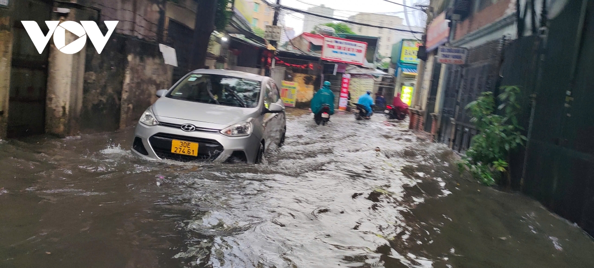 PV Sỹ Thành/VOV.VN đưa tin tại Hà Nội: Đầu giờ chiều nay đã có 1 cơn mưa lớn đổ xuống thủ đô, nhiều con phố đã có dấu hiệu ngập. Ngõ 381 Nguyễn Khang bị ngập 1 dài khoảng tầm 1km, khiến cho xe cộ đi lại khó khăn, lực lượng chức năng đang cố gắng xử lý cống thoát nước, hy vọng có thể giảm bớt ngập.