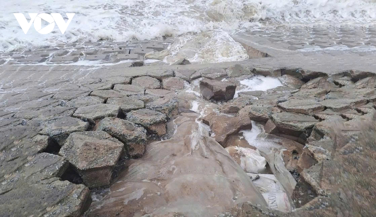 Đê biển Vĩnh Thái (Quảng Trị) bị sóng đánh sạt lở mái dài khoảng 20m, địa phương đã xử lý giờ đầu (xếp bao tải cát, đá hộc, rọ đá chỗ sạt); Đê cửa sông tả Bến Hải (Quảng Trị) nhiều vị trí mái phía sông bị sạt lở; hiện địa phương đang theo dõi diễn biến. Sạt lở 6.410m kè, bờ sông, bờ biển (Thanh Hóa 60m, Nghệ An 50m; Quảng Trị 3.300m; Huế 3.000m).