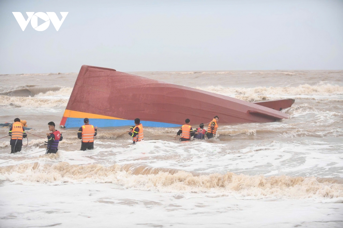 Thiếu tướng Nguyễn Thanh Liêm cho biết thêm, hiện nay trời không có mưa nhưng gió và sóng vẫn rất lớn, biển động dữ dội, công tác tìm kiếm cứu hộ cứu nạn còn gặp nhiều khó khăn. “Cho đến hiện nay chỉ có duy nhất thông tin về chiếc thuyền bị đắm ở khu vực này còn các khu vực khác chúng tôi chưa có thông tin gì mới. Lực lượng công an chúng tôi đang tích cực phối hợp với Bộ đội Biên phòng, lực lượng quân sự, chính quyền địa phương để huy động các phương tiện cẩu, kéo, đào đến hiện trường để tiến hành trục vớt con tàu lên. Chúng tôi hy vọng việc trục vớt con tàu sẽ tìm được các nạn nhân để có thể xử lý tại hiện trường”.