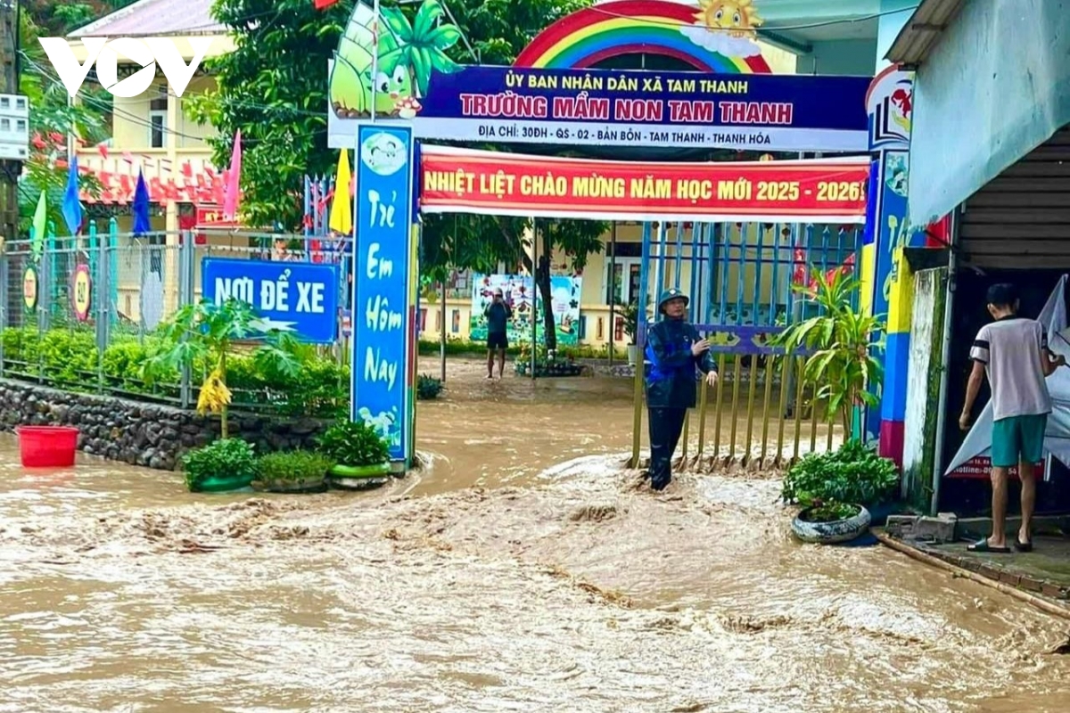 Tại khu vực trường mầm non xã Tam Thanh, nơi đã bị thiệt hại rất nặng nề trong cơn bão số 5. Hậu quả sau cơn lũ ấy chưa kịp khắc phục hoàn toàn nay lại tiếp tục hứng chịu cơn lũ trong cơn bão số 10. Bức tường bao quanh trường vừa được kè lại sau ảnh hưởng của cơn bão số 5, nay lại bị vỡ và cuốn trôi, nước lũ bao vây gây ngập lụt cả khu trường, toàn bộ khu vực bị mất điện hoàn toàn.